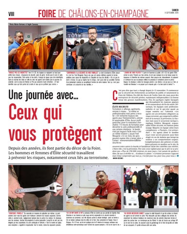 ’est peu dire que tout a changé depuis le 13 novembre. À commencer par la sécurité des événements accueillant du public et notamment la Foire de Châlons. Du côté des forces de l’ordre, bien sûr, mais aussi des entreprises de sécurité privées, maintenant indispensables à la bonne tenue des grosses manifestations. Fini, les quelques vigiles baraqués qui dissuadaient les mauvais payeurs et les emmerdeurs de fin de soirée. Désormais, les équipes sont professionÉLITE RECRUTE nalisées et sur le qui-vive quant au Formations à rallonge, agréments, remises à niveau… Le métier se risque numéro un : l’attentat. « Les professionnalise mais peine à recruagents ont une formation obligatoire au ter. « On recherche toujours des risque terroriste, qui comprend la définiagents pour l’événementiel », précise tion de la menace, la prévention, la réacle responsable d’Élite. Aucun profil tion mais aussi le secourisme tactique », particulier sinon la motivation d’enexplique Frédéric Mougené, responchaîner 175 heures de formation pour sable d’Élite sécurité, les fameux polos décrocher la carte professionnelle et orange. Répartis en équipe selon leurs une certaine résistance : le boulot compétences -« l’humain, c’est primorn’est pas toujours facile mais « c’est dial » – les agents (dont le nombre un métier d’avenir », assure Fred exact reste secret) peuvent aussi bien Mougené. « En six mois, les gens peuvent espérer être à temps plein. » réagir en cas de malaise que lorsqu’un visiteur a un comportement suspect. Contact : evenementielreims@eliteComplémentaires des policiers et milisecurite.eu taires présents en nombre sur le site, ils assurent entre autres la lourde et fastidieuse tâche des contrôles aux entrées. « Notre rôle, c’est la prévention. Être sans cesse vigilant pour que le pire ne se produise pas. » Plus de 250 000 visiteurs en onze jours, c’est autant de poches à tâter, de sacs à vérifier et… d’ardeurs à calmer : « Certaines personnes s’agacent mais il faut comprendre que tout ça, c’est fait pour eux, pour vous, pour nous. »