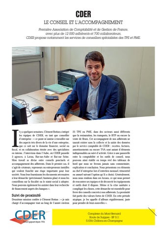 l y a quelques semaines, Clément Bottan a intégré les équipes de CDER, en tant que conseiller d’entreprise : « ce poste m’amène à travailler sur des aspects très divers de la vie d’une entreprise, que ce soit sur le domaine financier, social ou fiscal, et en collaboration étroite avec des spécialistes en interne. J’interviens dans l’Aube, où CDER possède 3 agences, à Lavau, Bar-sur-Aube et Bar-sur Seine. Mon travail se divise entre conseils ponctuels et accompagnement des adhérents. Dans le premier cas, il s’agit de créateurs, repreneurs ou entrepreneurs installés qui veulent franchir une étape importante pour leur société. Nous leur fournissons les documents nécessaires à leur démarche (prévisionnel, business plan) et nous les conseillons sur la fiscalité ou le statut social à adopter. Nous pouvons également les assister dans leur recherche de financement auprès des banques ».