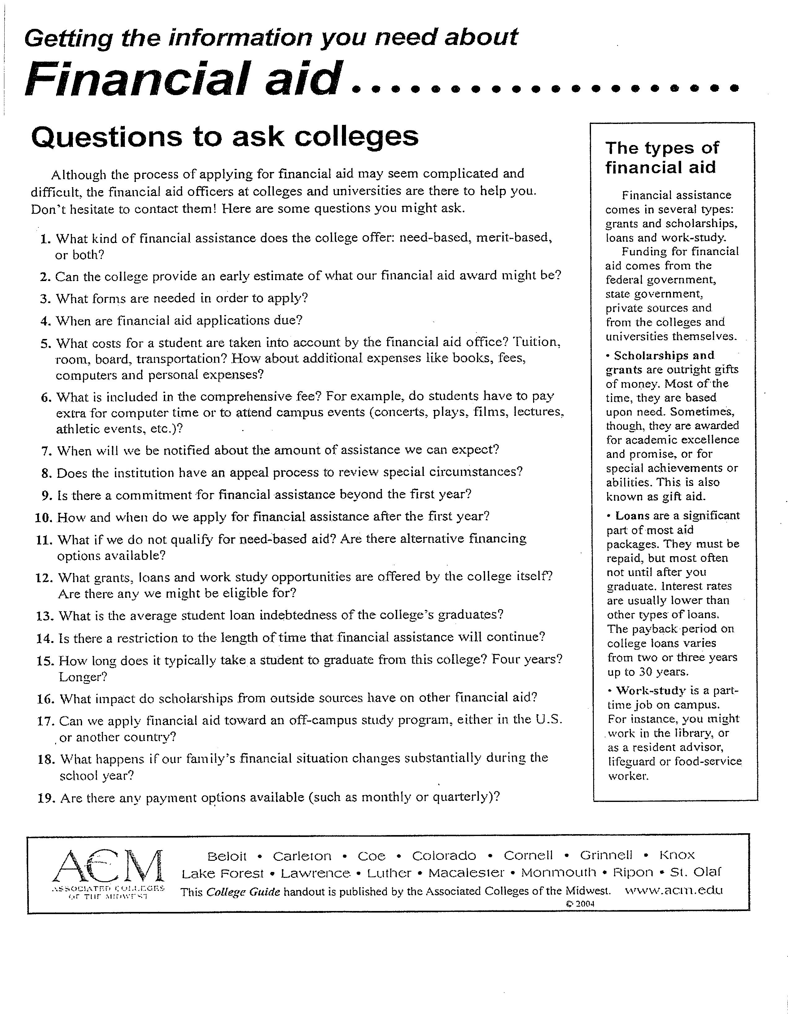 Basically, there are four types of financial aid: scholarships (sometimes called merit aid), grants, loans, and work-study programs. Depending on your financial need, students may be eligible for one or more types of aid. Most financial aid packages contain a combination of types of aid to avoid overburdening of loans or employment.