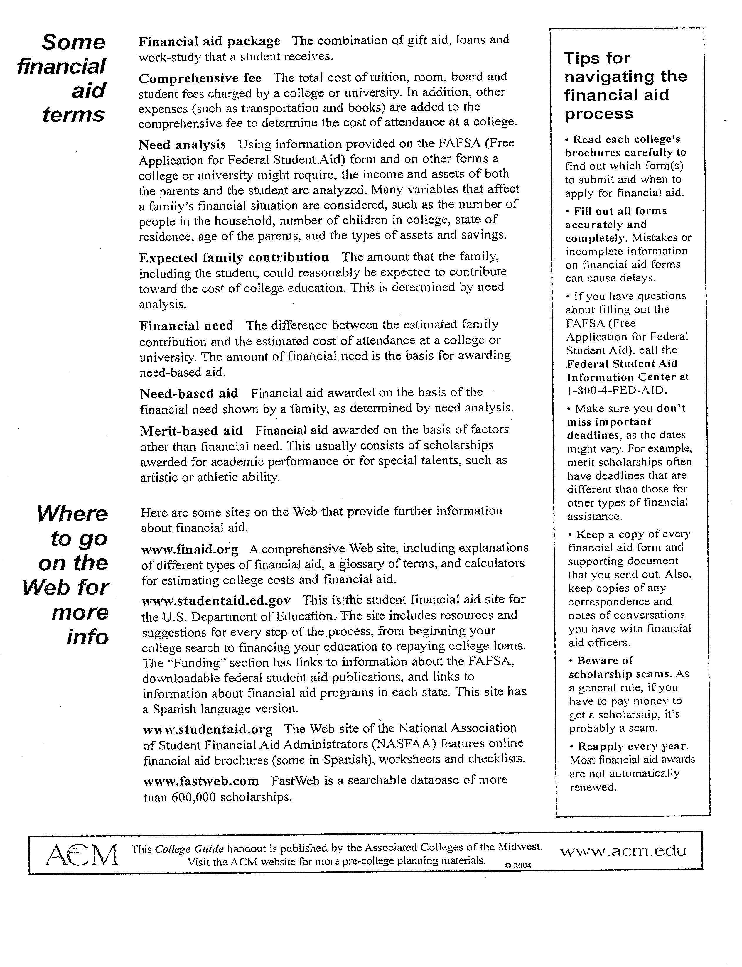 Each fall, the counseling department sponsors a financial aid professional to review the process with senior parents; each winter, we sponsor a parent workshop on completing the Free Application for Federal Student Aid (FAFSA). One common mistake is to rule out a particular college because it seems too expensive. Often schools that advertise annual tuition costs of $40,000 or more are also the schools that give more financial aid. Therefore, sometimes schools with higher tuition end up being more affordable than the lower priced institutions.