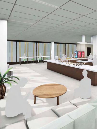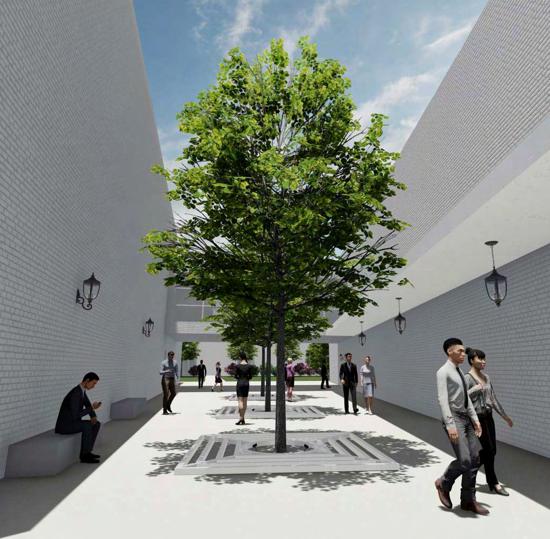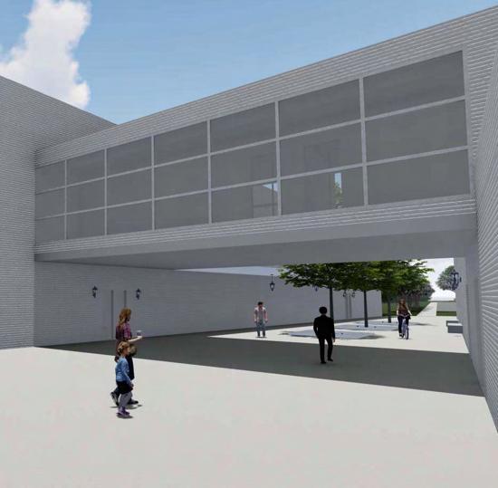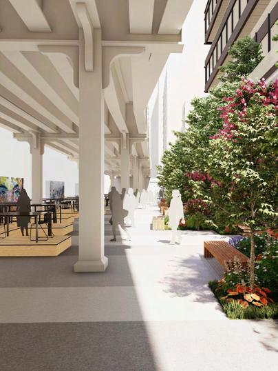 stairwell and the H-Vac rooms. The less-dense screening covers areas such as the cafe and work areas allowing plenty of natural light to enter the space. The screening is elevated so the first floor is open to the exterior and is inviting to bypassers. The layout of our program continues the high level of activity from the street and as you go up the building, less activity and less noise occur. On the ground floor behind the building and under the Highline, a plaza was added to bring life to the area and to expand on the idea of exterior spaces. The plaza and the balconies mimic the pushing and pulling of material that the Highline does, which designates walkable spaces versus green space. In the plaza, green spaces are situated closest to the building so the sun can reach it. Underneath the Highline are elevated seating areas that people of New York can utilize for working space or a place to eat food. The area between the green space and sitting space is the walkable area that cuts from 26th Ave to 27th Ave. A unique aspect of the plaza is the addition of partition walls that local artists can paint and have outdoor exhibit space.