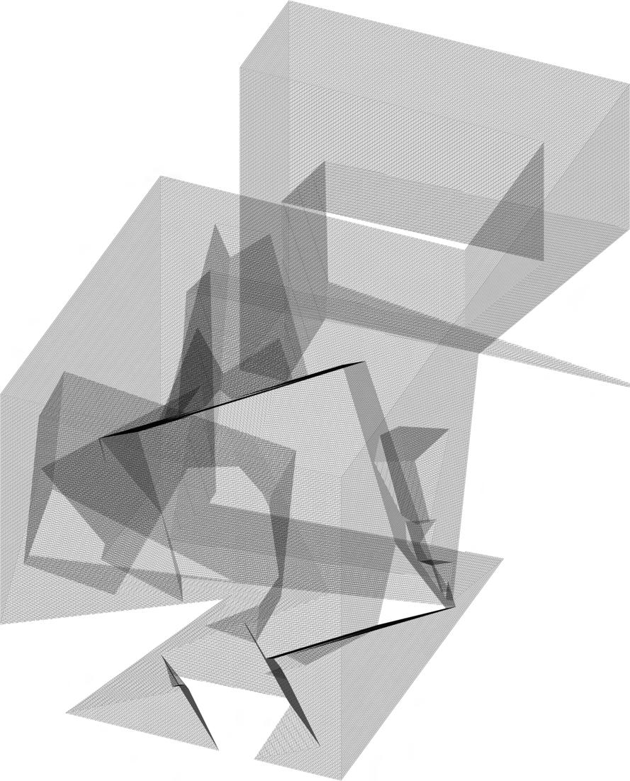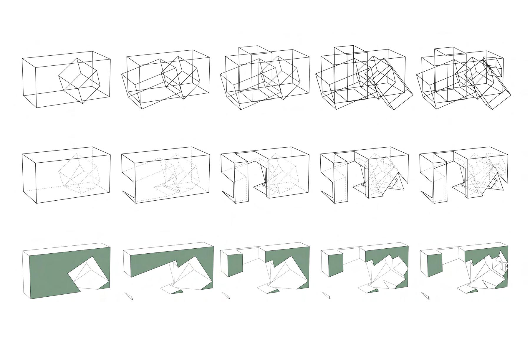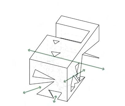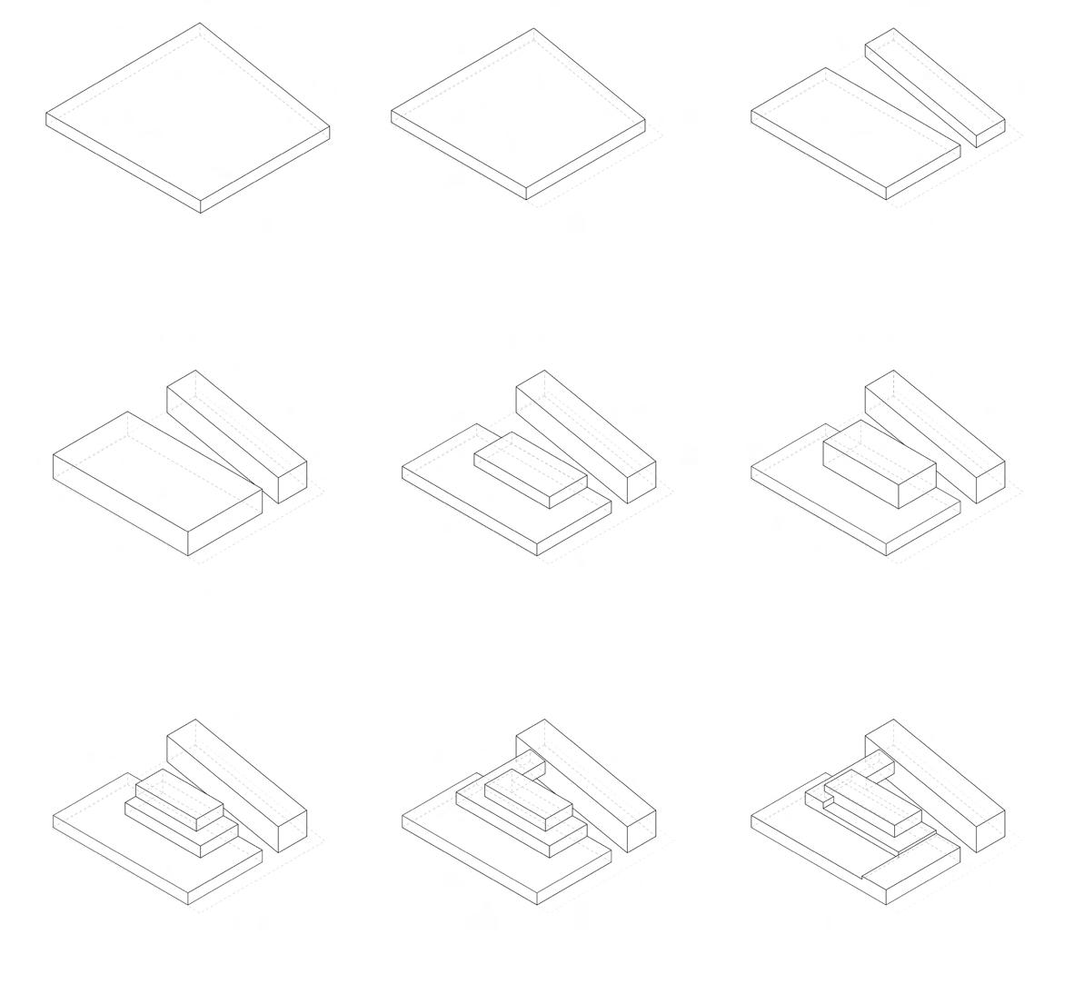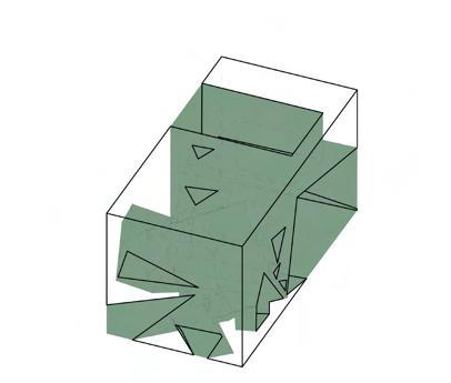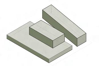 The design of the Hub revolved around boolean operations and cutting out of a mass. Given a 10x20x10 box, we had to collide and extract different shapes to create a new design. I started the process by placing a square in the box and boolean it out. I continued extracting one shape at a time until I had boolean a total of 5 shapes. I started the process of placing these shapes at random, but the more I boolean out a shape the more I thought about where my next one would go. It then became about how I can add places for people to sit, places people can walk through, and where light can enter the space. To incorperate these ideas into the space, I added two