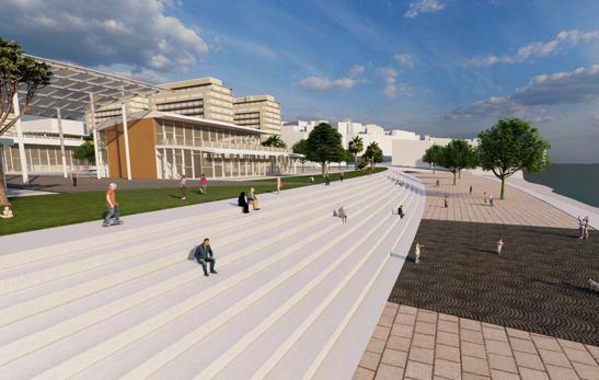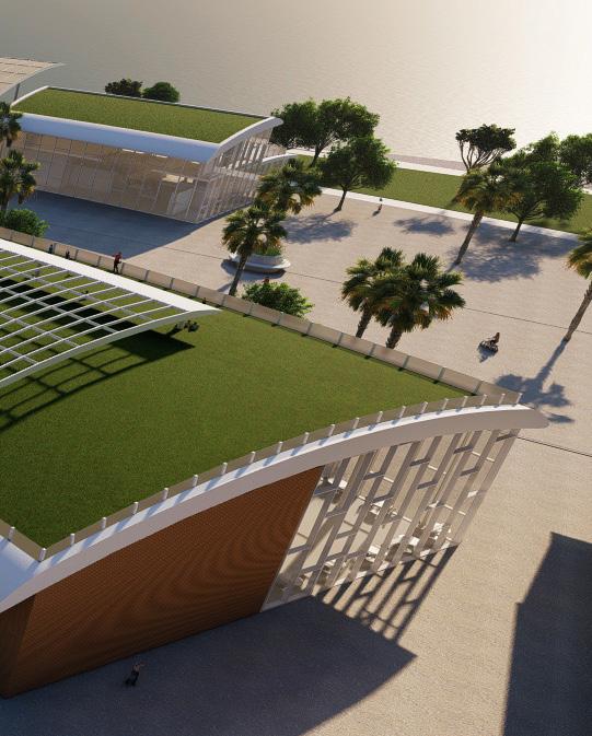 speak. Commercial spaces make up the building on the most prominent site and includes a coffee shop, book store, and art gallery. Coffee is an essential element in the Italian culture and we wanted to give them a place to sip a cup of coffee and look out over the sea. Assigning moods to the outdoor spaces promotes intimacy by elevating green space, fostering social behavior by interacting with rain gardens, and engaging one’s senses with adjacency to the water. The middle site was originally a park that we did not want to get rid of in its entirety, so we relocated it to the larger site and redesigned it for all groups of people could enjoy the exterior space. Landscape architecture informs experience by stimulating visitors to participate in the sensory moods assigned to each site, while the architecture promotes the singular axis to the sea.