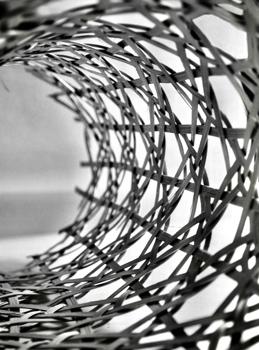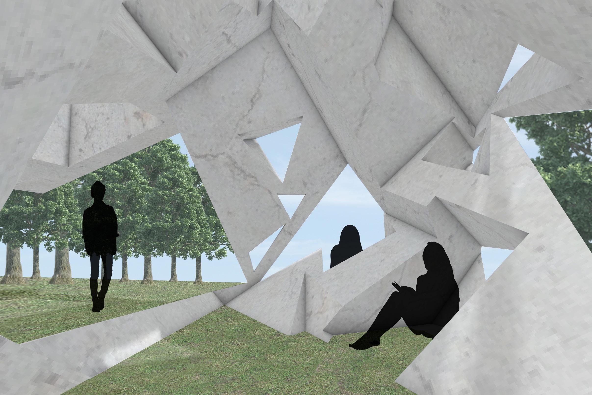 pavilion by creating simple bending designs and making multiple iterations of those designs to get my final design. This semester we also learned about topography. The site is surrounded by a parking lot on one side and buildings on the other. To block out noise from the parking lot and make the pavilion more secluded I created hills. The pavilion is designed for the circulation of people to walk in from both the parking lot side and from the architectural building. The pavilion is closed off on the side that faces the back of the buildings on the north facade and is open to a lawn on the south facade. The grid shell is a simple triangle pattern that allows an abundance of light to enter and maintain good air circulation.