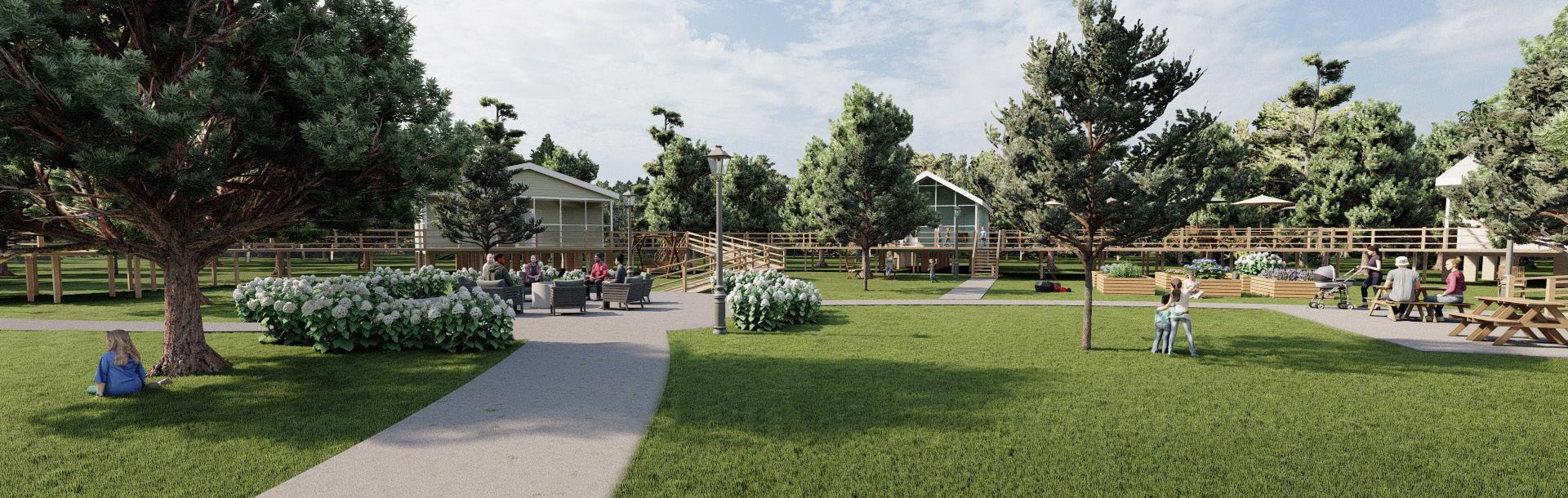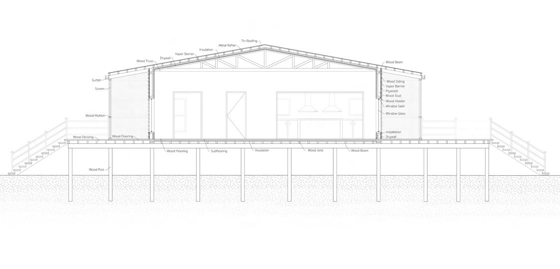 where the public areas such as the kitchen, living room, and dining room are housed. This building has a wrap-around screen porch and is the start of an elevated decking that connects all of the buildings. This decking also creates a new exterior public space and a barrier from the forest around. Outside the ring of buildings and the decking is the natural landscape of the forest, but once you move past the decking, the landscape is more manicured and allows for public activities. The activities include a fire pit, picnic area, garden space, and open flexible spaces. The design of the buildings uses different design elements from buildings seen on the island. They have an A-frame roof or hip roof, wood siding, and a screen porch, and they are elevated because of its close proximity to the ocean.