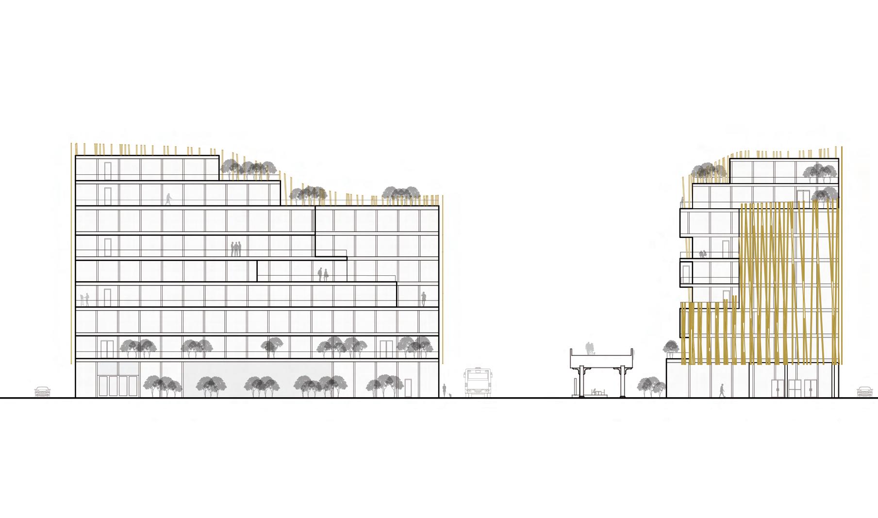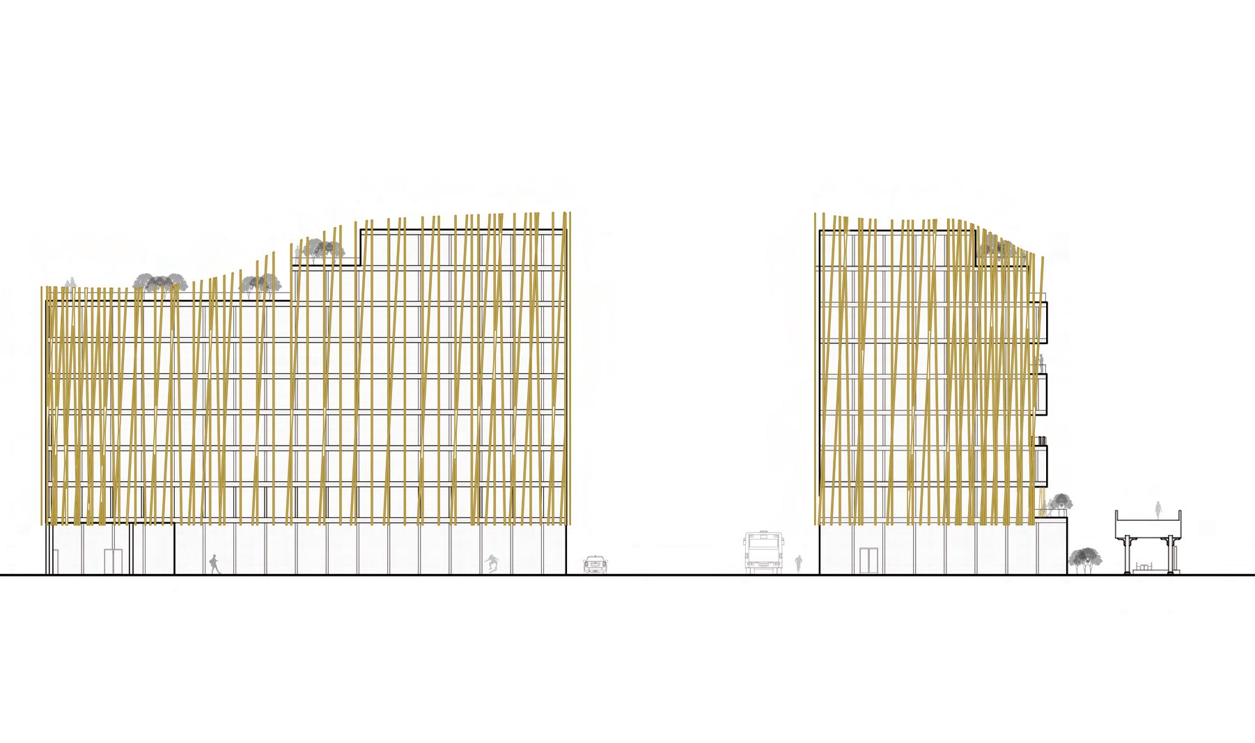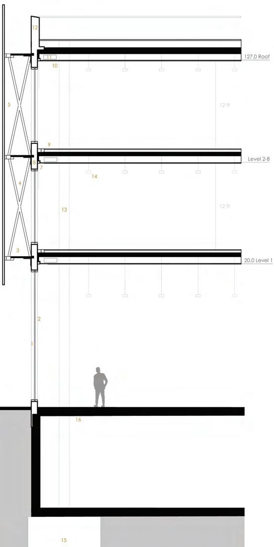 The Parallel is an office building for the affordable housing complex situated across the street. The building provides a wide range of services for these residents to utilize. The name parallel comes from the idea of connecting the Highline to the building without physically touching it. On the facade facing the Highline, the massing is pushed and pulled in certain areas to create balconies and outdoor spaces. These outdoor spaces allow for views of the city and the Highline and views from the Highline into the building. One of the main elements included in the building is the use of a glass curtain wall which allows for interior views overlooking the city. The concern with the curtain wall was the amount of sunlight hitting the building and entering the interior spaces which causes the interior temperature to be warm. To help solve this issue and create a subtle way for the building to stand out amoung the other building in Manhattan, a screening was added on three of the four facades. The screening is made of gold-painted aluminum cladding which changes densities depending on what is on the interior. The areas where the screening is denser are more private areas, such as the