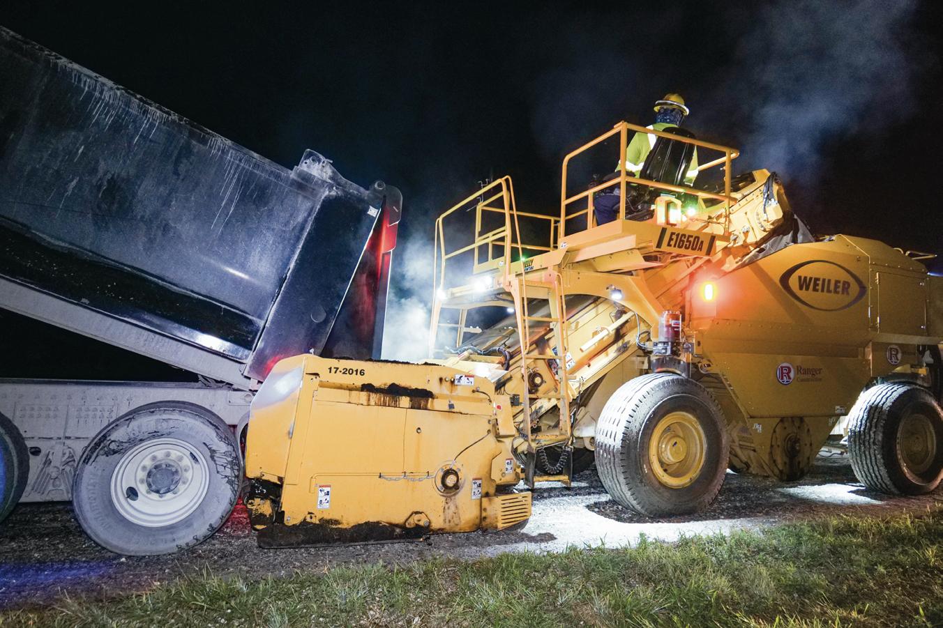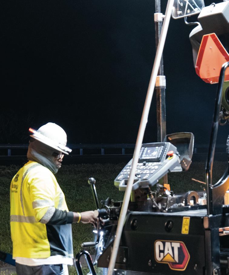 At the same time, paving crews are placing 1.5 inches of structural asphalt on the travel lanes and 1.25 inches on both the inside and outside shoulders. Several sections of the outside shoulder also include overbuild to meet grade requirements.