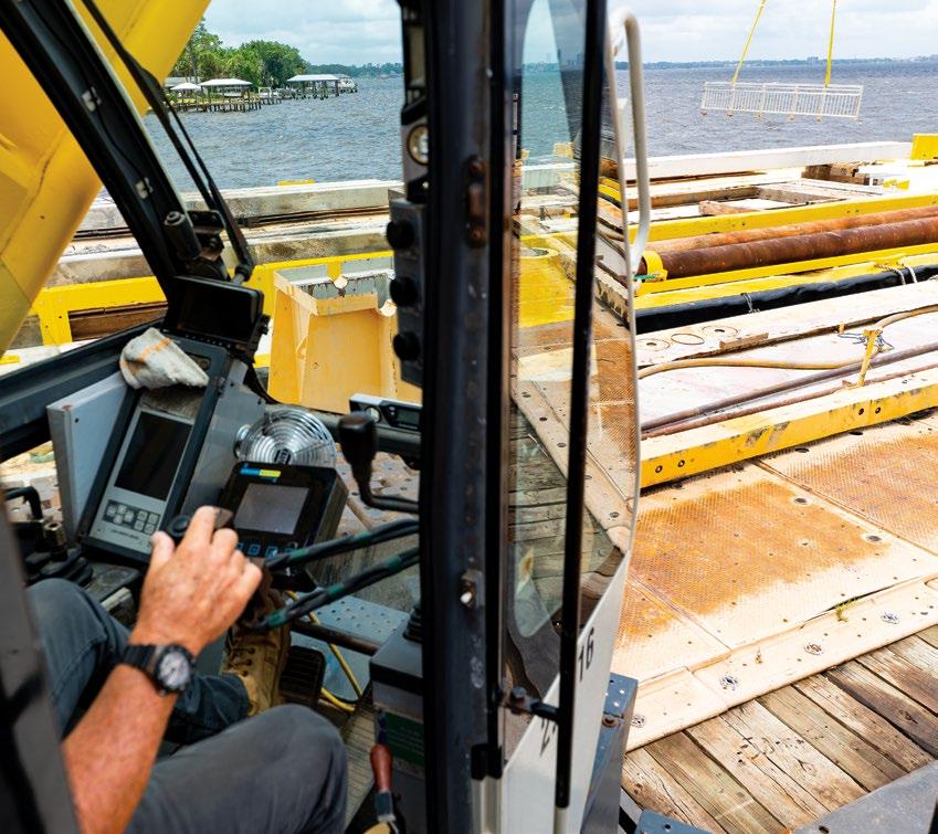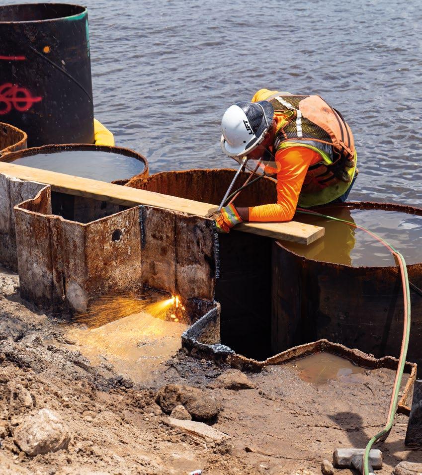 At left, the 36” pipe pile are being cut to grade in preparation to form for the concrete bulkhead cap. Above, Westley Diotte, Working Foreman, is stiffening a 36” pipe pile probe used to check pile locations for voids or obstructions.
