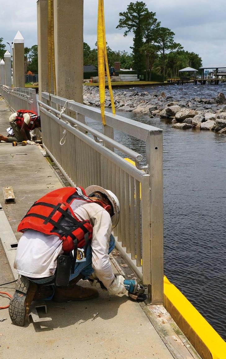 The photos above and right show crews removing the existing metal railing from the docks. Once detached, the crane will move it to the barge (top right) to be hauled away. With the railing removed, crews will begin replacing the old dock.