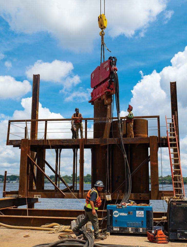 The vibratory hammer is moved into place (middle right) by David Miller, Crane Operator.