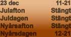 Lördag 24/12: Stängt Söndag 25/12: Stängt Måndag 26/12: Stängt Tisdag 27/12: 9-17