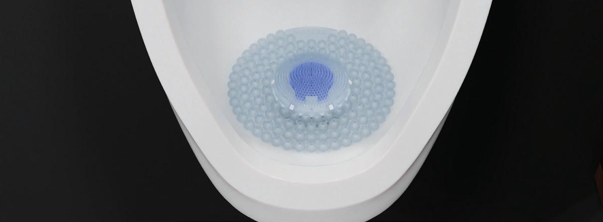 A 30-day trough urinal screen with a bubble and bristle design that prevents splashback and drain blockages while delivering consistent fragrance.