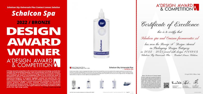 Schalcon SpA, controllata dal 2021 dalla Omisan farmaceutici, è stata insignita del premio internazionale A’ Design Award 2023, per il design del packaging della sua soluzione unica per lenti a contatto Schalcon Sky Universale Plus, l’unico prodotto medicale tra quelli premiati.