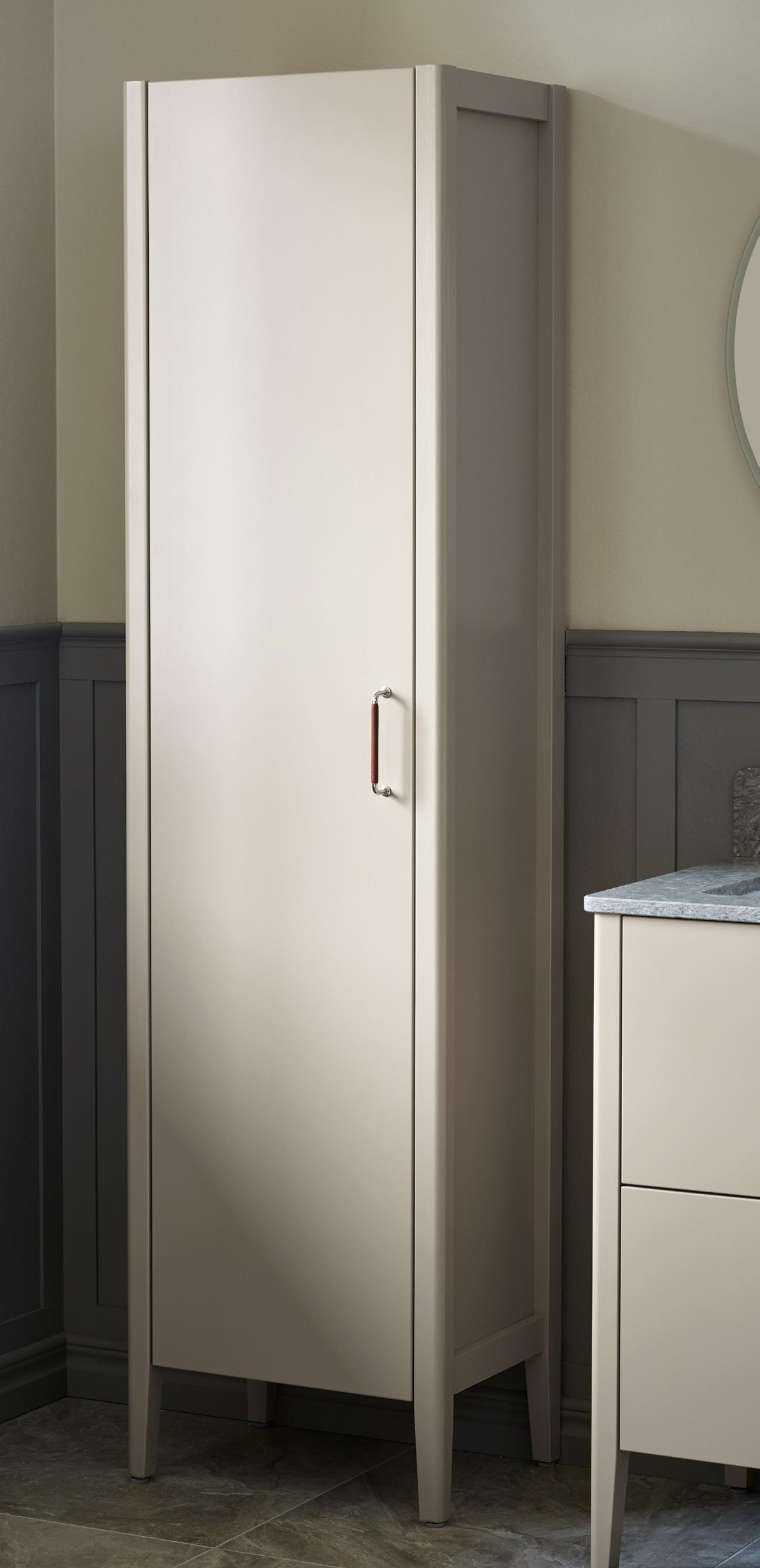 HÖGSKÅP ANNO BAS, 18.155:480 mm, lucka Moa F88 linnebeige, handtag 31036 Akleja cc 128 brunt läder/krom. Mer fakta om serien på s. 20–25.