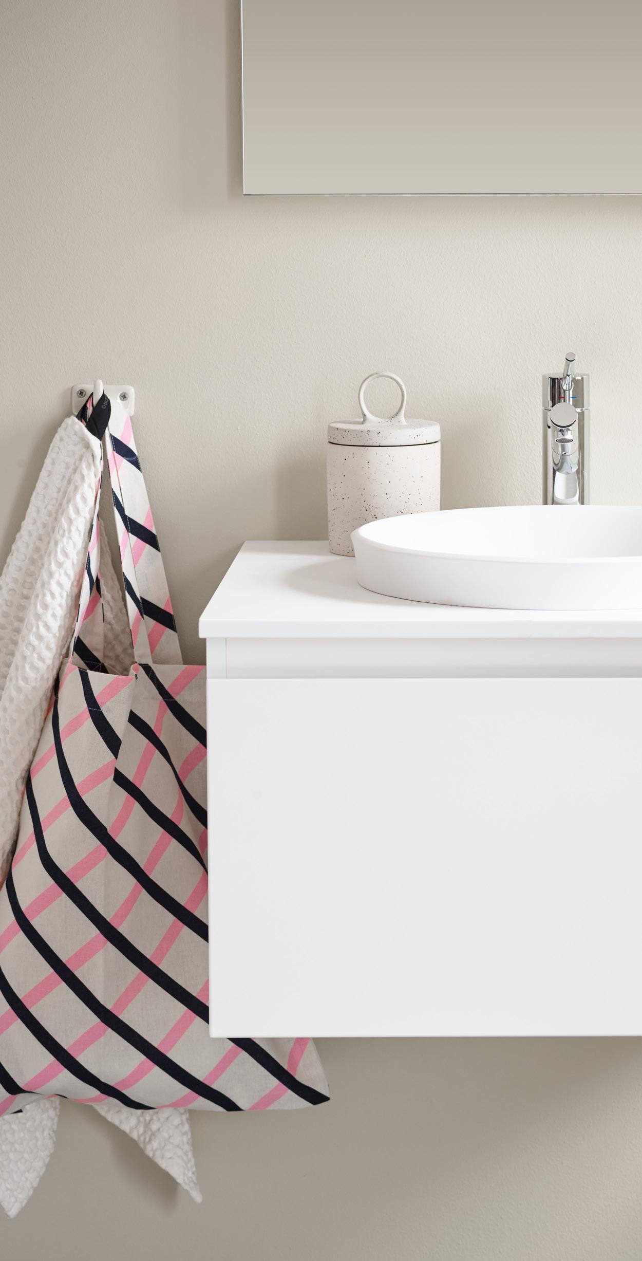 När Anno hittar in i badrummet är möbelkänslan stark och förvaringsutrymmena generösa. I år har vi uppdaterat Anno både på insidan och utsidan. Här visar vi Anno i ny bredd, med luckan Edit och nya lådor med ny inredning. I vår nya jordröda kulör, handtag ton i ton tillsammans med vitpigmenterade furuväggar och rutigt golv är Anno verkligen i sitt rätta element. Möblernas mjuka former återkommer i den runda spegeln med fint dekorljus. Tidlöst för vår tid.