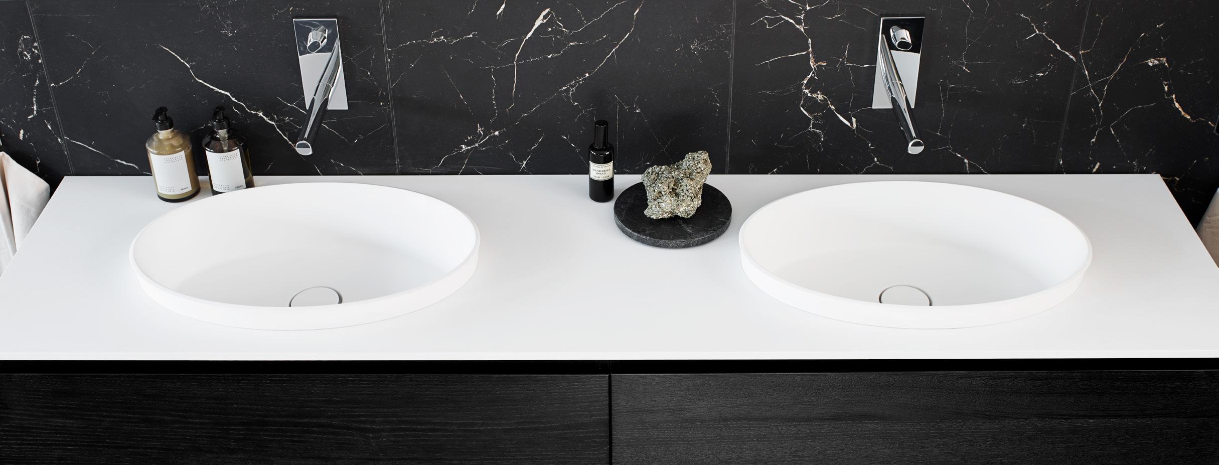 Solid Surface: Är tillverkade i det stenliknande, slitstarka och lättskötta kompositmaterialet Solid Surface. Trots sitt namn är materialet solitt rakt igenom. Solid Surface har funnits på marknaden sedan 1964 och kallas ibland också akrylsten. Solid Surface är dessutom ett bra miljöval, eftersom det bland annat är tillverkat av mineraler från naturliga källor. Rengör ytan med vatten och tvål eller ett milt rengöringsmedel för att ta bort de flesta fläckar och smuts som kan ha lagt sig. Materialet tål max 70 grader. Geltvättmedel och slipande produkter rekommenderas särskilt i kombination med Scotch Brite-svamp. Skölj ytan noggrant med rikligt med vatten. På så sätt kan du se till att den ursprungliga distinkta ogenomskinliga finishen av Solid Surface bevaras säkert.