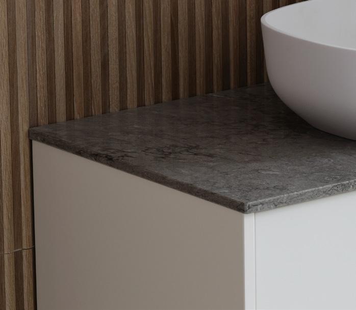 Tvättställ Anno med underlimmad porslinsho och topplatta Turbine Grey. Stänkpanel i Turbine Grey.