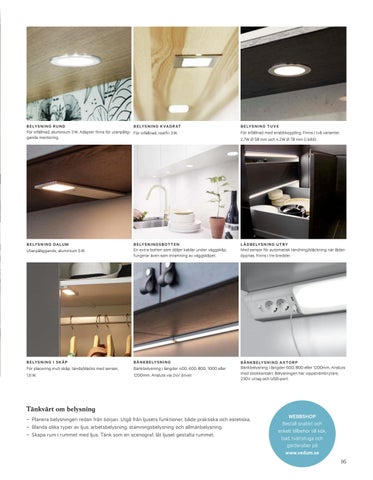 Tänkvärt om belysning –– Planera belysningen redan från början. Utgå från ljusets funktioner, både praktiska och estetiska. –– Blanda olika typer av ljus; arbetsbelysning, stämningsbelysning och allmänbelysning. –– Skapa rum i rummet med ljus. Tänk som en scenograf, låt ljuset gestalta rummet.