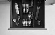 Spegellucka med ram i 19 mm massivt trä och fanerad spegel, svagt rundad kant, radie 2 mm, rambredd 60 mm. Vitrinlucka med spröjs och klarglas. Levereras i natur ek, vitpigmenterad ek (matt yta), svartpigmenterad ek och valnöt. Luckor i bredder upp till och med 196 mm, luckor i höjder upp till och med 220 mm och fronter i höjder upp till och med 230 mm levereras släta. Stående trämönster på luckor och lådfronter. Kan även fås i täckmålad ek i kulörerna F149 betonggrå och F158 varmgrå mot kulörtillägg.