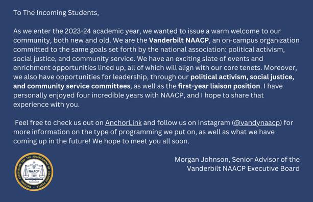 Our team is looking forward to meeEng each of you along your journey at Vanderbilt and consider us a primary resource for your academic and personal achievements. You are truly walking into a community that feels and views itself more like family.