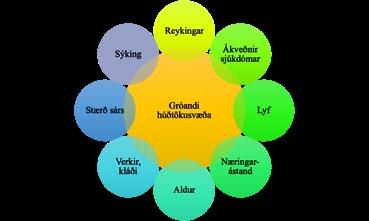 Tafla 1. Áhrifaþættir á gróanda húðtökusvæða sem voru til staðar hjá þátttakendum (n=16)