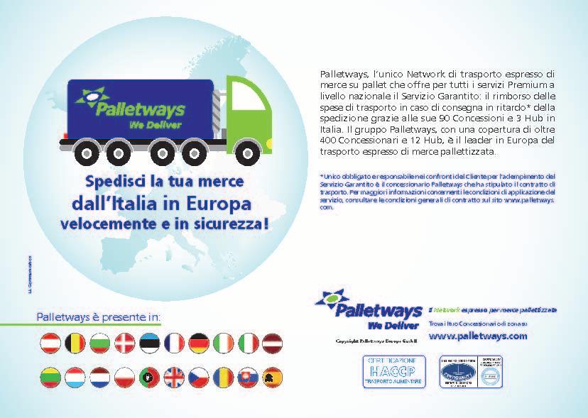 niva effettuato solo in Gran Bretagna, ci si rende conto di quanto sia man mano cresciuta negli anni la forza del nostro Net work: sono state aperte le filiali di Italia, Spagna e Germania, è stato siglato un accordo commerciale con un importante operatore per la gestione del traffico in Francia e si prosegue, passo dopo passo, rispondendo alle esigenze di un mercato che, con la globalizzazione, si è spostato a est. Palletways si sposta dov’è necessario per i clien ti, dove vengono richieste le merci. Oggi, l’espansione verso i paesi del Mar Nero permette al Network Palletways Italia di avere accesso a nuovi mercati e cogliere inedite opportunità commerciali; grazie a questa iniziativa, pos siamo incrementare ulteriormente la soddisfazio-