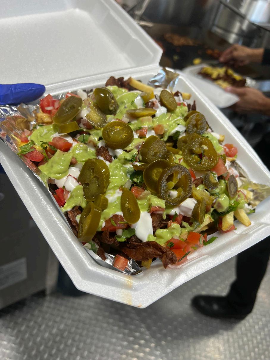 The fries loaded (no chicharron), a cold horchata, and the carne asada tacos. Trust me, perfection.