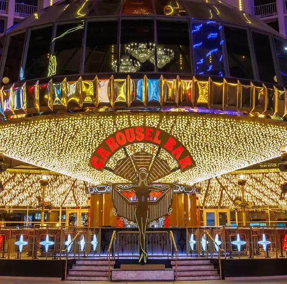Carousel Bar’s fun and infectious design includes carousel horses that move up and down, a ribbon of lights rotating above the bar and life-sized, Las Vegas-themed elements such as a deck of cards, a spinning martini glass and a 14-foot-tall neon showgirl sign at the entrance.