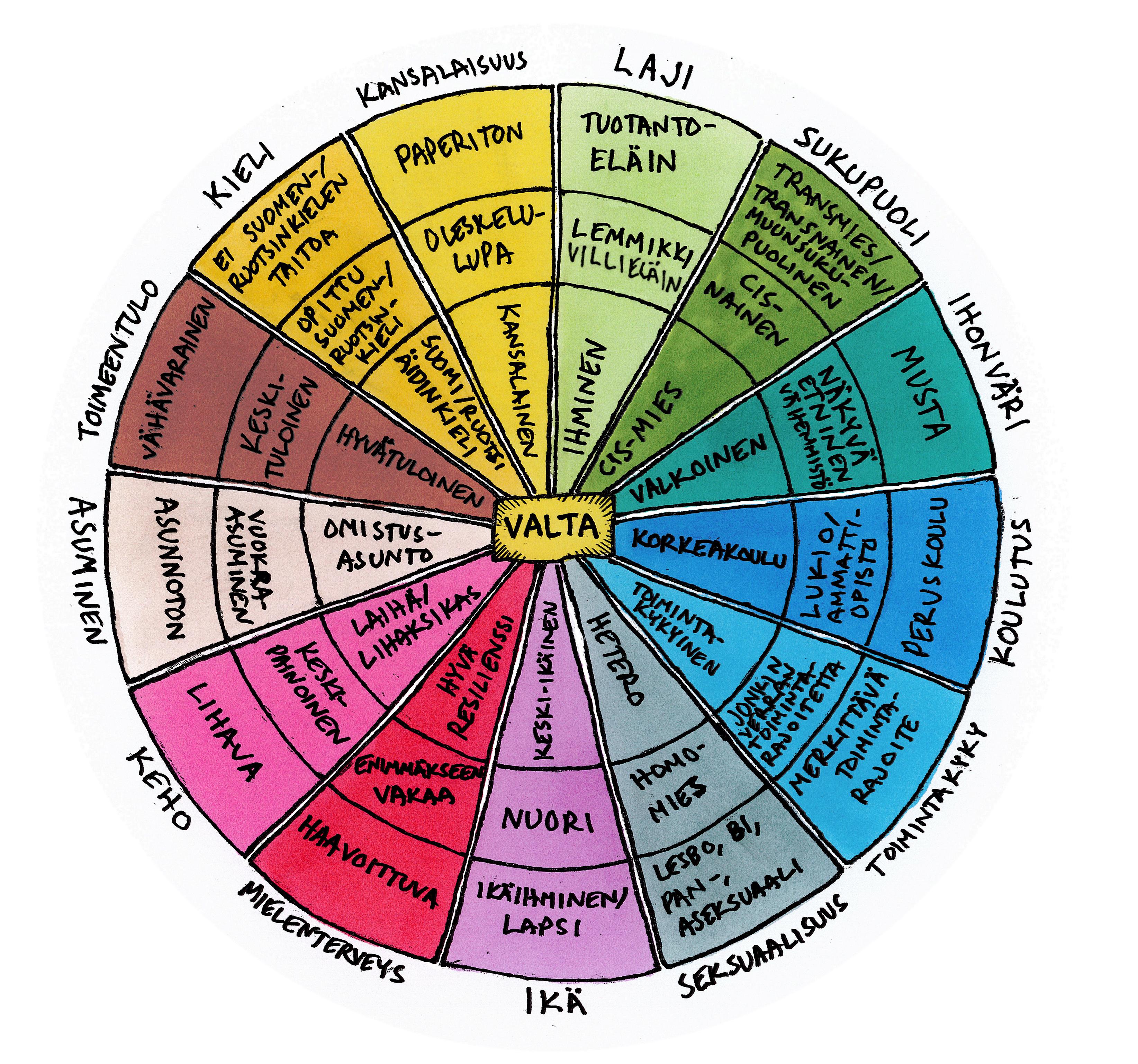TiinaOllilamäärittelikolumnissaan etuoikeuskehänvisualisoinniksi,jota käytetäänihmistenapunaymmärtämään, millaisessaasemassaitseonsuhteessa muihin Kehässäonmuunmuassa ihonväri,sukupuoli,seksuaalinen suuntautuminenjakoulutus Vegen kehässäonlisänäeläinlaji(s 16)
