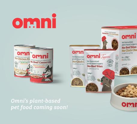 Omni has launched a wet vegan pet food range that utilises their patent-pending meat texture technology and has been likened to chunks of real beef and chicken. The range includes toppers enriched with vitamin B12 and iron to be added to dry food, and nutritionally complete tins of wet food.