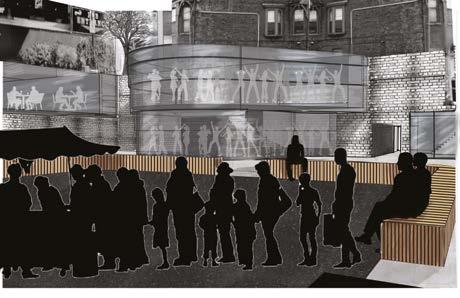 This is a render of the view from the skating area during the summer. This space is transformed into a social, food vender and seating space. This view also demonstrates the relation of the underground club and the existing heritage house.