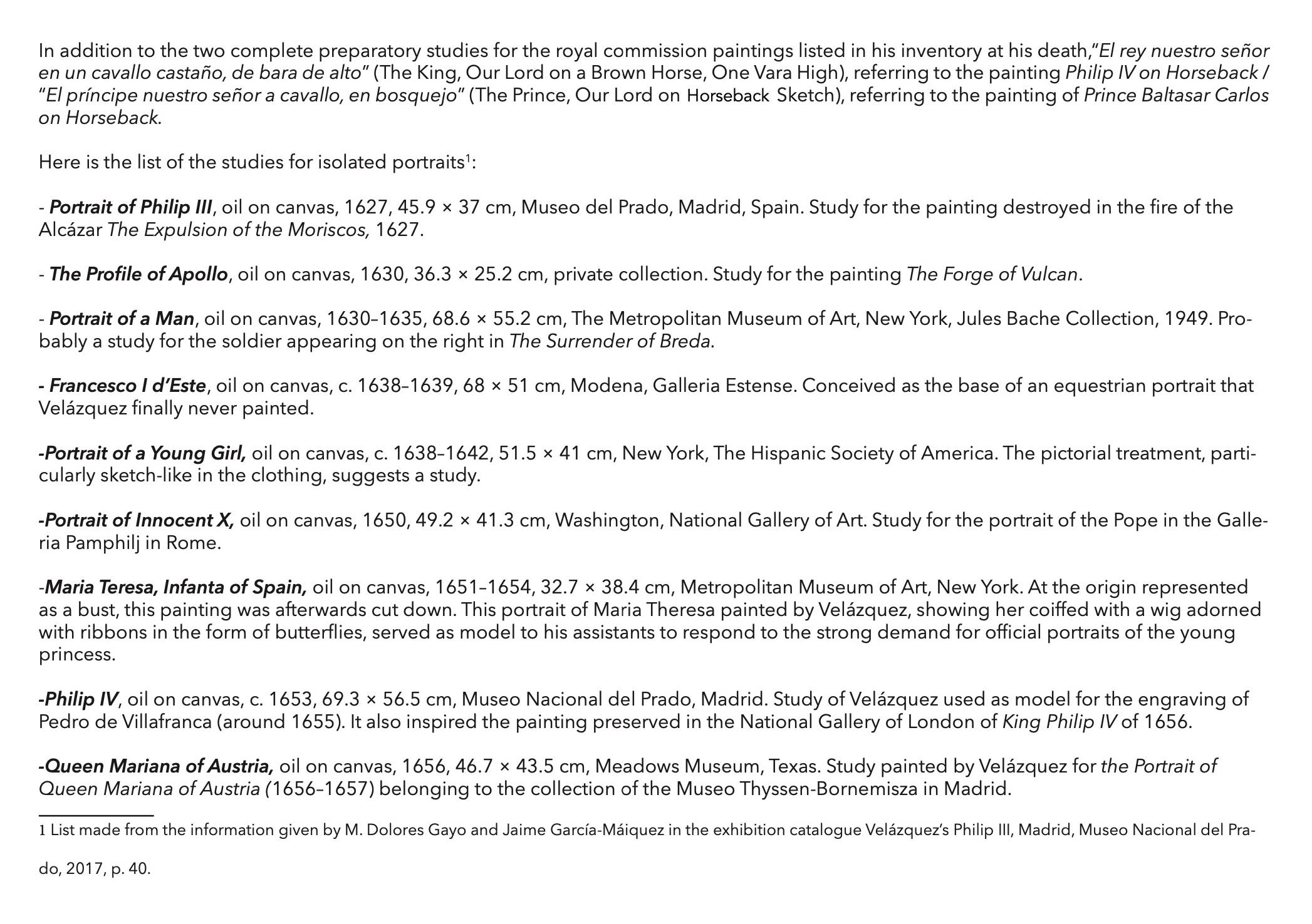 An exhibition bringing together Velázquez’s preparatory studies would offer an exciting opportunity to gain a deeper understanding of his creative process and would thus make it possible to better distinguish the fully authentic works from those produced in collaboration, as well as from the works of assistants or followers. It could present the preparatory head studies already mentioned above for major paintings of royal or papal commission, as well as the rare drawings attributed to Velázquez and, fnally, our painting, which appears to be the frst complete preparatory study identifed in relation to a major painting of royal commission.