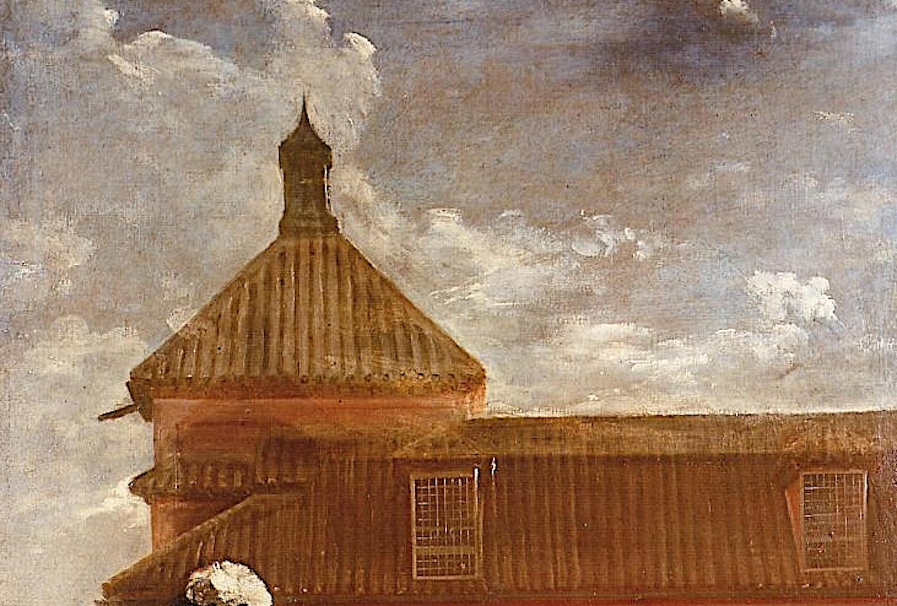 Detail of the painting Baltasar Carlos in the Riding School. The sky, with its clouds, was painted before the landscape. Over time, the clouds have reappeared in transparency along the entire length of the roof.