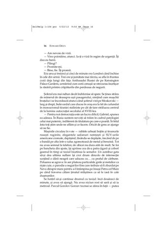— Am nevoie de vizæ. — Vino poimâine, atunci. Ia°fli o vizæ în regim de urgenflæ. Îfli dau eu banii. — Plângi? — Promite°mi. — Bine, fie. Îfli promit. Era unu øi treizeci øi cinci de minute ora Londrei când închise în cele din urmæ. Trei ore øi jumætate mai târziu, se afla în fruntea cozii deja lungi din fafla Ambasadei Rusiei de pe Kensington Palace Gardens, urmærind cum zorii cenuøii se strecurau încetiøor la ræsærit printre cræpæturile din perdeaua de neguræ. Øoferul era mai nebun decât îndræznise sæ spere. Se flinea strâns de mânerul de deasupra uøii pasagerului, simflind cum muøchii braflului i se încordeazæ atunci când øoferul viræ pe Moskovski — larg øi drept, bulevardul care ducea în oraø era la fel de cufundat în monocromul tiraniei staliniste pe cât de tare strælucea centrul de la lumina autocrafliei secolului al XVIII°lea. — Pentru noi democraflia este un lucru dificil, Gabriel, spunea ea adesea. În Rusia suntem nevoifli sæ træim în cadrul patologiei celui mai puternic, indiferent de titulatura pe care°o poartæ. În felul æsta tofli øtim unde ne aflæm øi ce facem. Oricât de greu ar ajunge sæ ne fie. Maøinile circulau în voie — rablele ceheøti boflite øi troancele ruseøti ruginite, elegantele sedanuri nemfleøti øi SUV°urile americane cromate, depæøind, læsându°se depæøite, trecând de pe o bandæ pe alta într°o salsa zgomotoasæ de metal øi benzinæ. Tot nu avea semnal la telefon; de obicei nu dura atât de mult. Se foi pe bancheta din spate, îøi aprinse cea de°a patra fligaræ øi coborî geamul în timp ce taxiul încetinea la semafor. Un autobuz gata sæ°øi dea ultima suflare îøi croi drum dincolo de intersecflie scoflând o dâræ neagræ care aducea cu… cu praful de cærbune. Poluarea se agrava: în aer pluteau particulele grele øi metalice ca niøte cuie, o parodie a negurilor fine care trebuie sæ fi zburdat pe Neva dinspre mare pentru a°l întâmpina pe însuøi Petru cel Mare pe când traversa cælare flinutul mlæøtinos ca sæ le iasæ în cale duømanilor. Se hotærî sæ°øi continue drumul cu taxiul: încæ douæzeci de minute, øi avea sæ ajungæ. Nu avea niciun rost sæ saræ øi sæ ia metroul. Parcul Gorolov Goroev tocmai se zærea în faflæ — putea