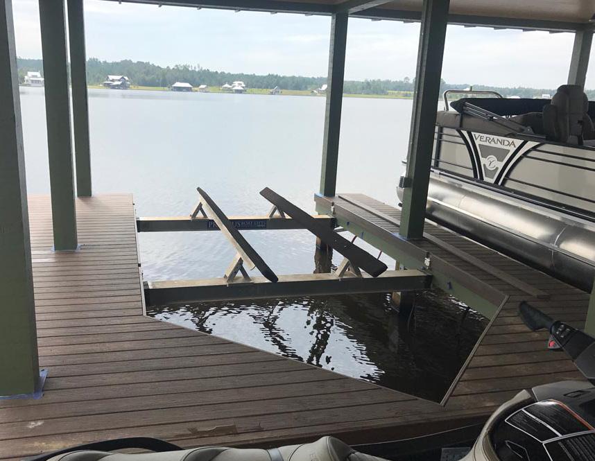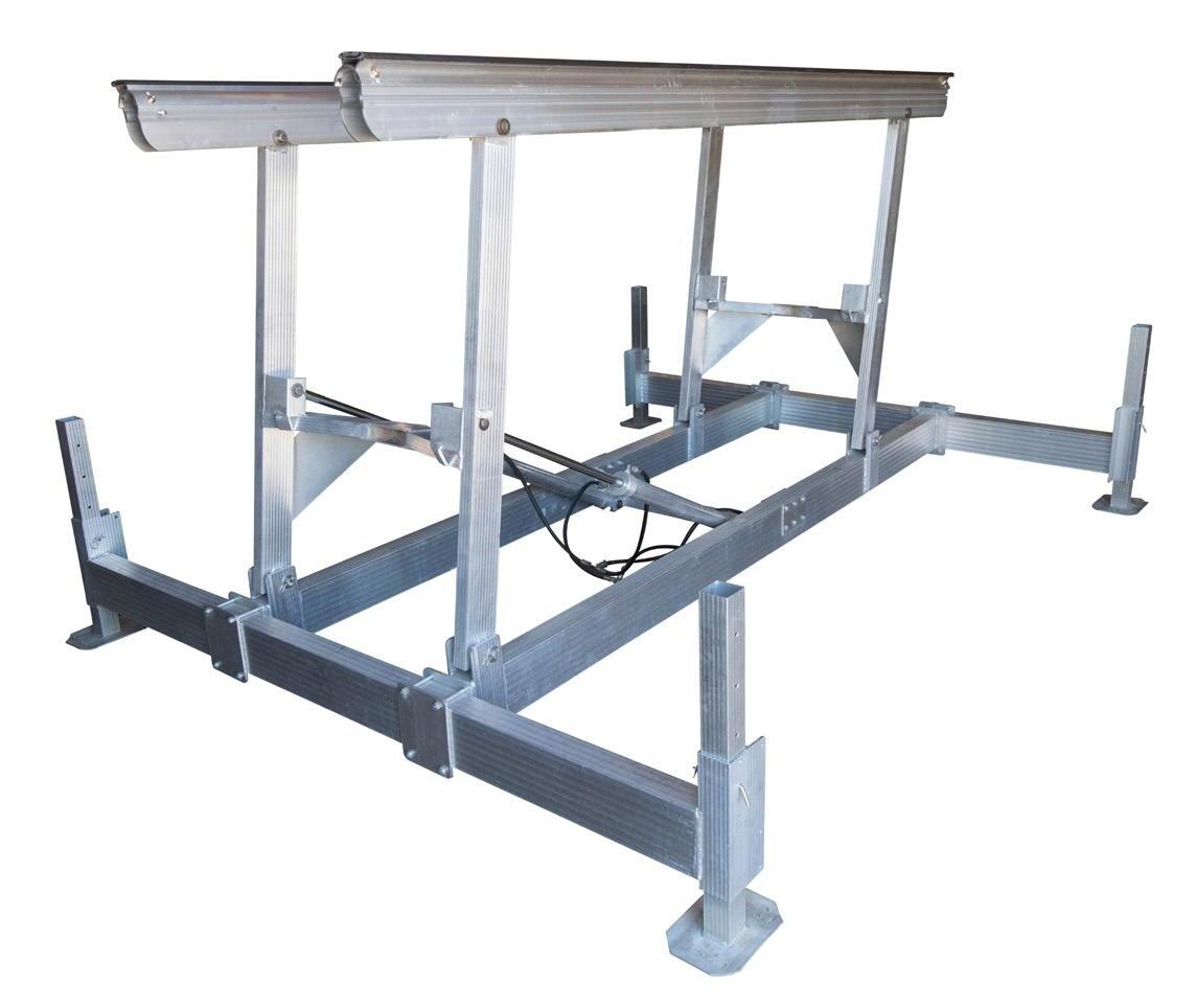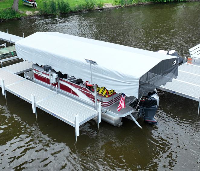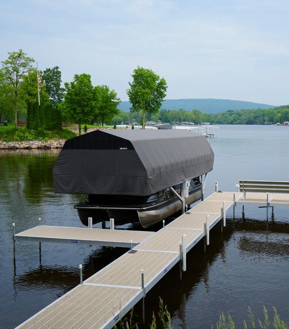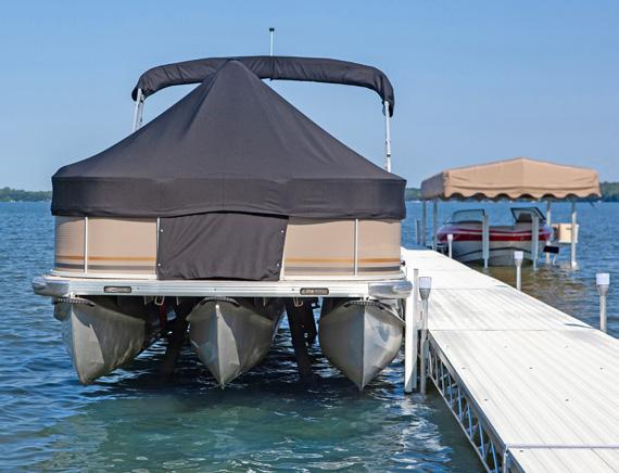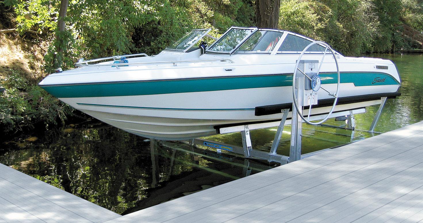 The Hewitt hydraulic cantilever lift brings ultimate convenience to your dock—just press a button, and your boat or pontoon is in the water and ready to go. Designed for shallow conditions, it operates in as little as 6” of water, making it ideal for shorter docks. Available in 3900 lb and 5200 lb capacities, it features a corrosion-resistant, all-aluminum frame with fulllength adjustable bunks, a keel protector, and four adjustable leveling legs with quick-release pins. Backed by a 15-year warranty on the aluminum and welds, it’s a durable, low-maintenance solution for easy, efficient boating year after year.