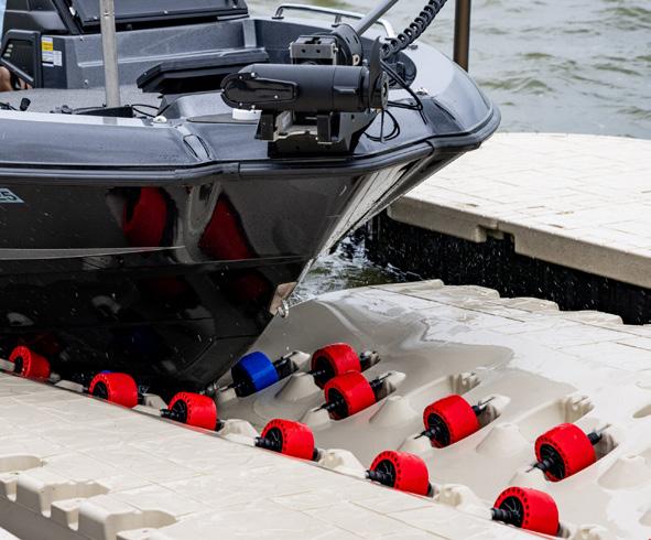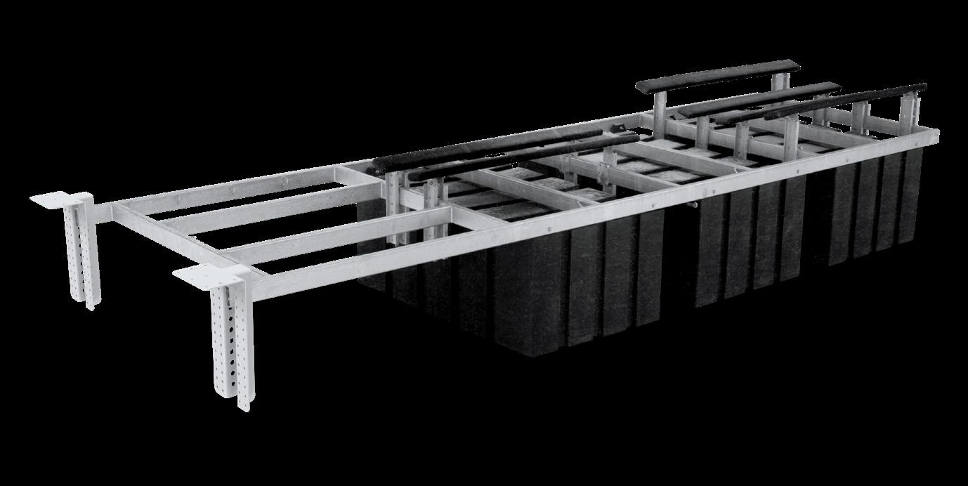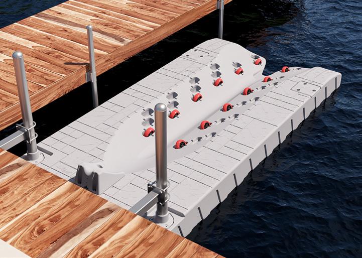 Designed for versatility and performance, this highly customizable bunk system features a sliding aluminum rail that easily adjusts to fit boats from 23’ to 32’ and supports up to 8,000 lbs. A shockabsorbing roller system delivers smooth, confidenceinspiring docking, while entrance rollers provide extra guidance and support for effortless loading every time. Need more lift for heavier motors? Additional buoyancy of up to 2,000 lbs. can be added for extra peace of mind. Built to last, the durable rotomolded shell is 100% foam-filled with marine-grade EPS for superior strength and flotation, and flexible front or side mounting options make installation simple and adaptable to your dock setup.