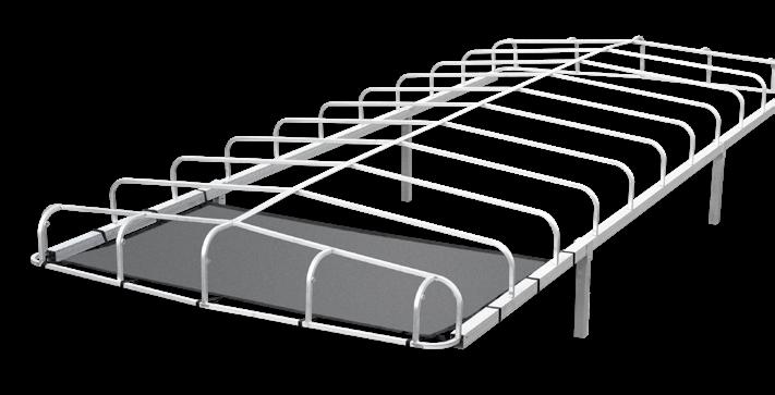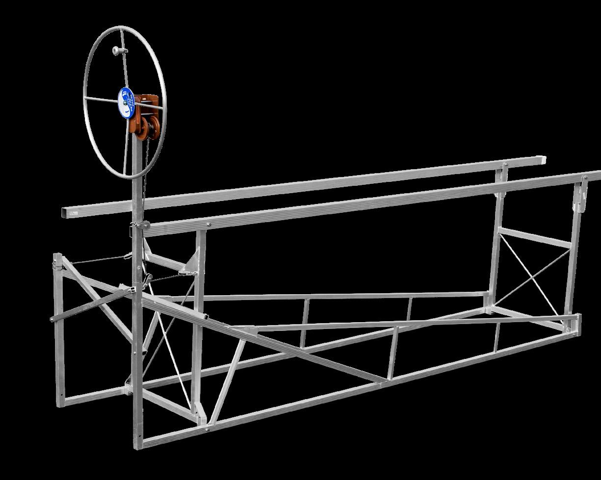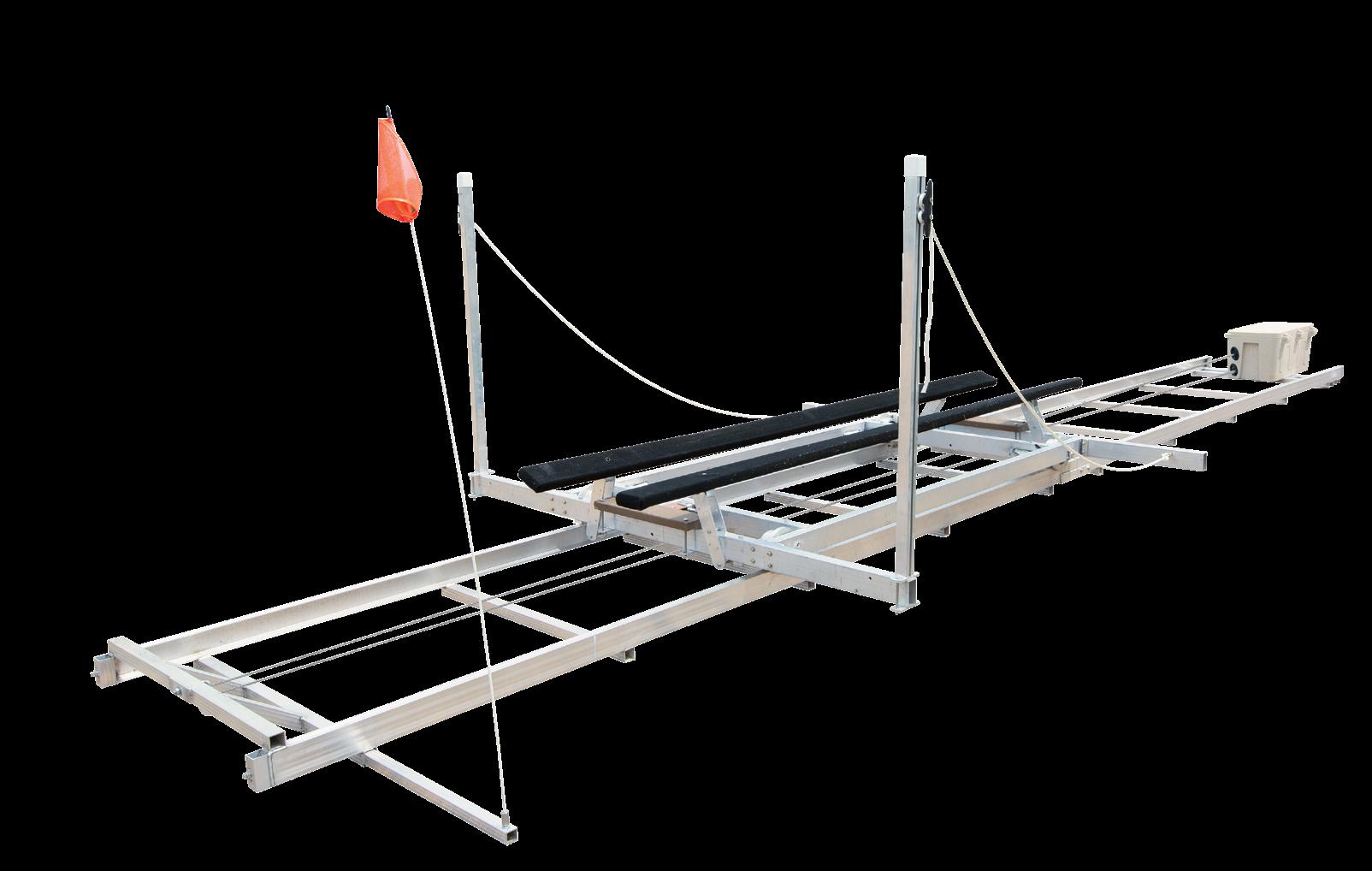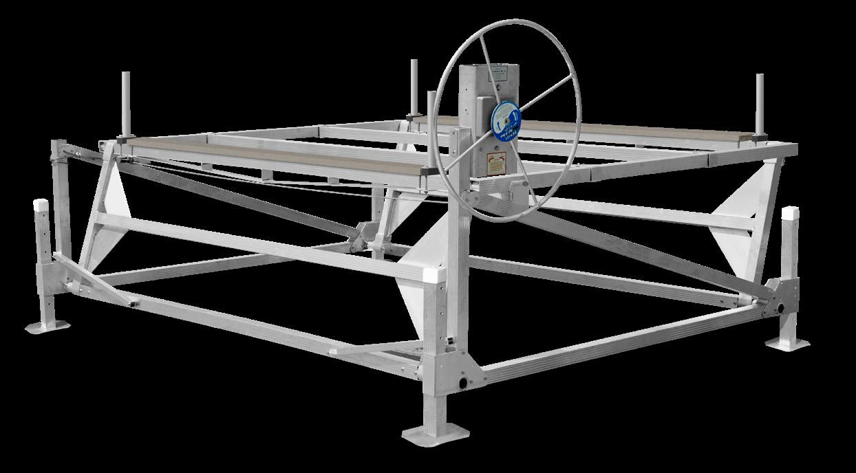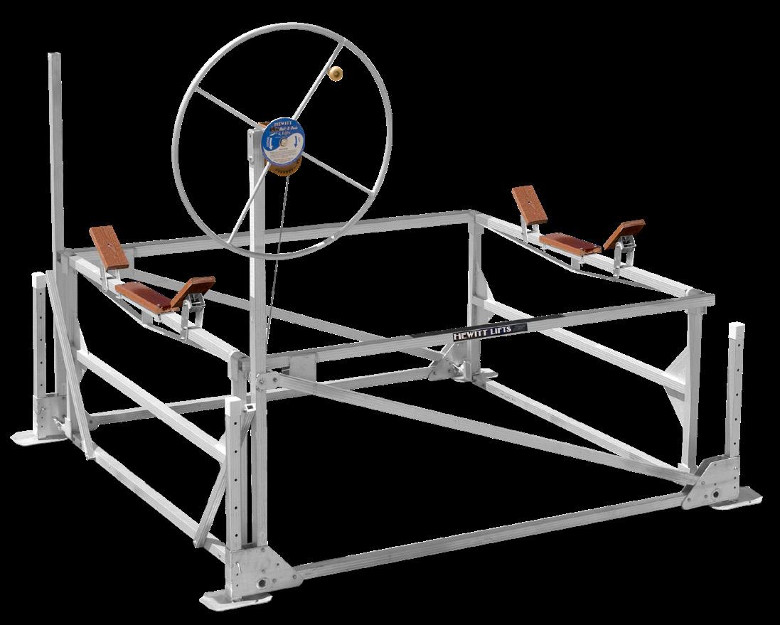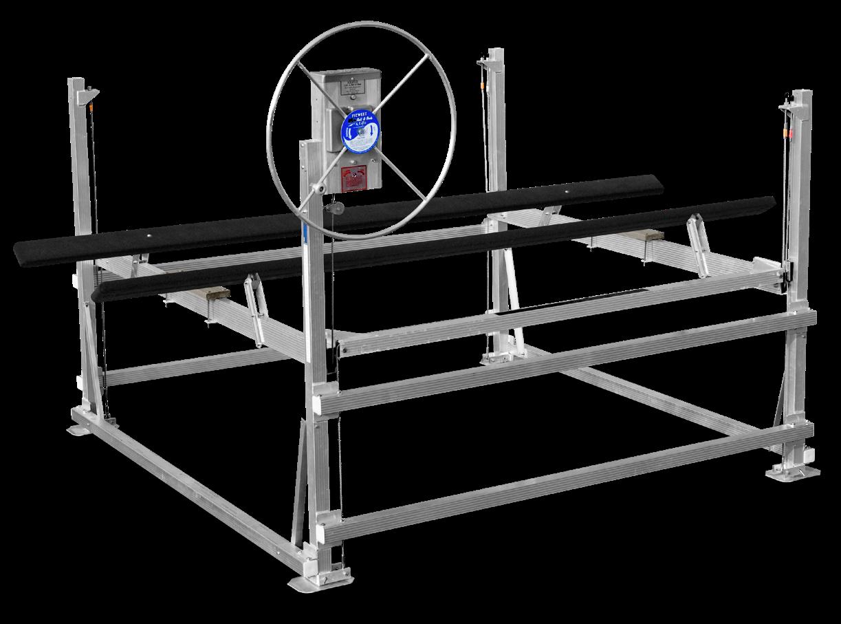 Hewitt’s narrow pontoon lifts are built to handle even the longest pontoons with ease. Designed with full-length beams that support the boat from between the pontoons, they evenly distribute weight and prevent damage. Available in 2000, 2400, and 3000 lb capacities with lengths up to 28’, these lifts feature all-aluminum frames, stainless steel cables, and durable plastic pulleys for long-lasting, lowmaintenance performance. When fully raised, the boat rests on the frame—not the cables—reducing wear and maximizing lift life.