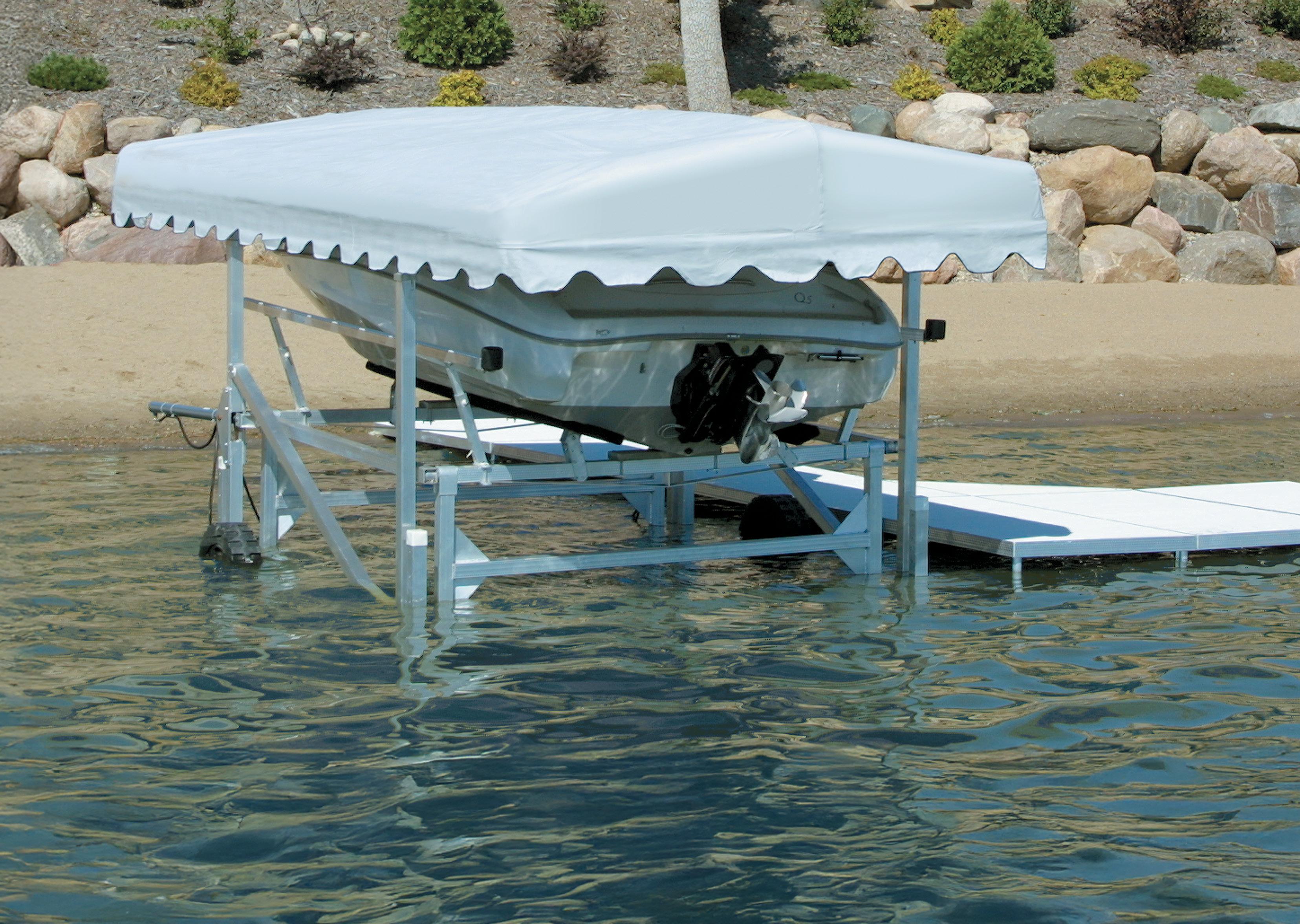 The perfect companion for floating docks, floating lifts are ideal for deep water applications but can be used in as little as 4’ to 8’ of water (dependant on lift size). BoatPort lifts may be installed on almost any structurally sound aluminum, steel or wood floating dock that has an “L” or “U”-shaped configuration where there is at least one walkway finger or pier extending down the side of the boat. Lift operation requires access to a 115V AC receptacle. Optionally, a small portable generator or 24V battery may be used to power the pump lift. BoatPort lifts can also be installed on stationary docks provided water levels do not rise or fall more than a total of 16”.