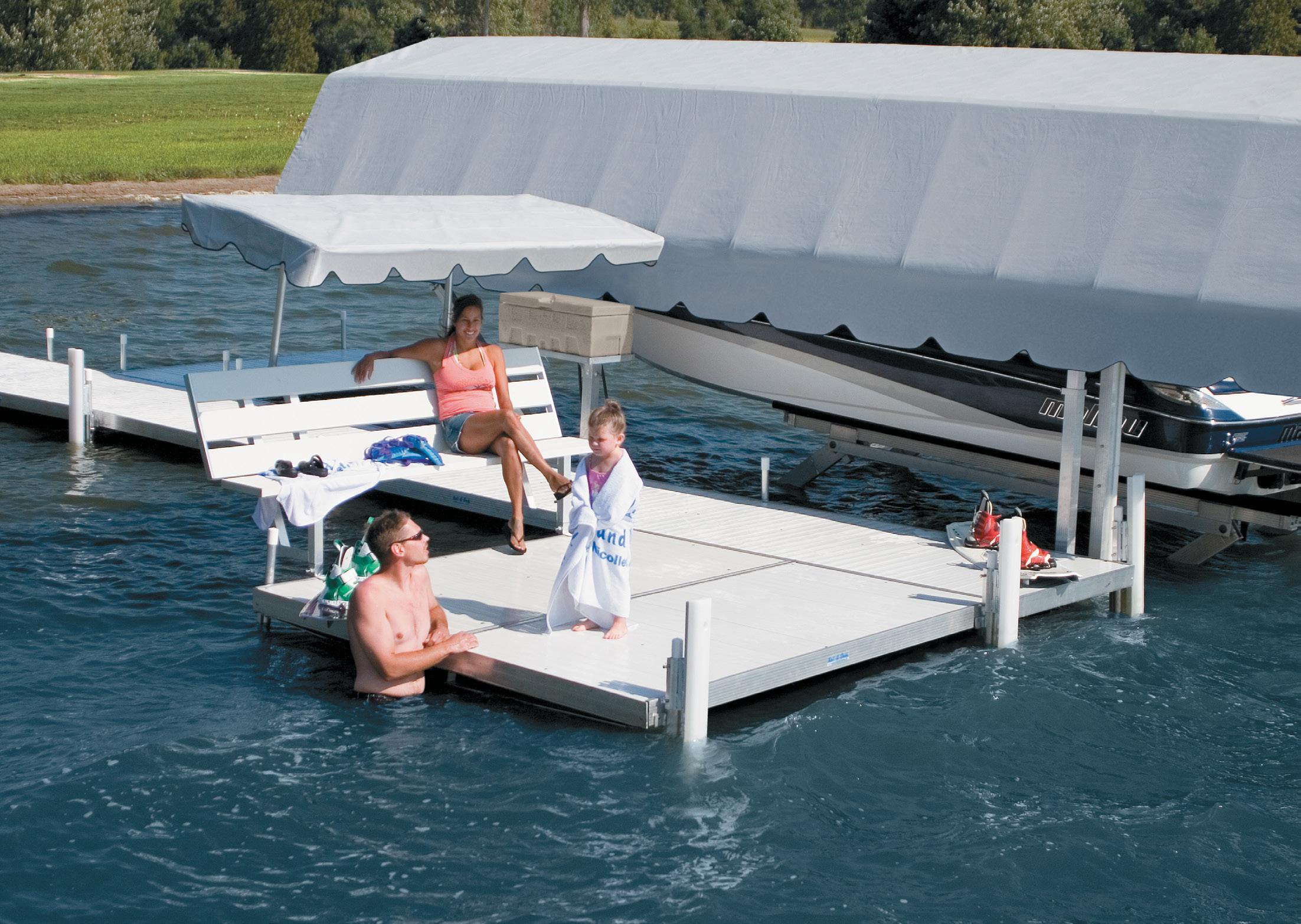 Hewitt Sectional Dock™ systems offer greater economy, quick setup and minimal maintenance. Frames and decking are preassembled in easy-to-handle modules. The aluminum sides wrap around the decking to maintain a crisp, clean appearance. Dock sections are 8’ and 10’ long and come in both 4’ and 6’ widths. Sections may be joined end-to-end or turned at right angles to form “L”s, “T”s, and platforms. Frames, poles, and brackets are all made from rustproof, corrosion-resistant aluminum and never need painting.