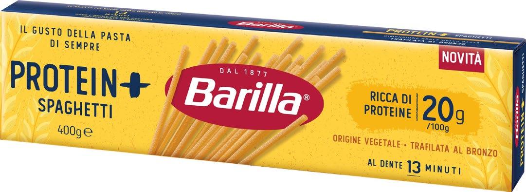 Il primo protagonista della nuova offerta è Barilla Protein+, una pasta che conserva le caratteristiche e il sapore della tradizione, con l'aggiunta di 20 grammi di proteine di pisello per 100 grammi di prodotto. Realizzata con semola di grano duro selezionata e proteine vegetali, la linea risponde alla crescente domanda di alimenti funzionali senza compromettere l'esperienza gustativa tipica italiana. Ci sono voluti due anni di lavoro e oltre 660 test per riuscire a ottenere una pasta con le stesse caratteristiche di quella tradizionale in termini di tenuta in cottura, gusto e colore, ma con il 30-40% di proteine in più per porzione. Disponibile nei formati Penne Rigate, Fusilli e Spaghetti in confezioni gialle da 400 grammi.