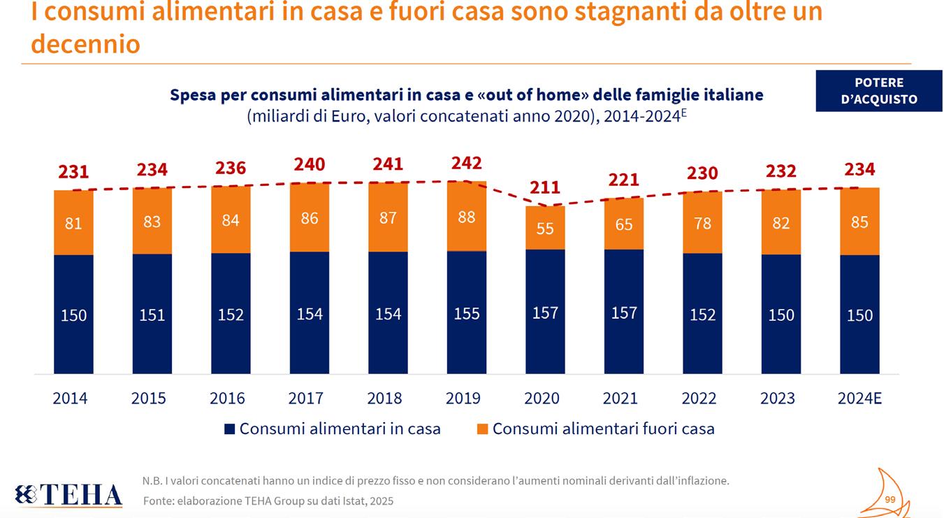 Nel 2024 i consumi alimentari fuori casa in Italia hanno raggiunto gli 85 miliardi di euro rimanendo ancora sotto i livelli del 2018 (87) e 2019 (88), un risultato anche effetto dell’inflazione che ha posto pressione sulla capacità di spesa dei cittadini. I dati elaborati da TEHA in occasione della 9a edizione del Forum Food&Beverage di Bormio evidenziano come da oltre dieci anni la spesa per il cibo, sia in casa sia fuori casa, sia rimasta sostanzialmente uguale.