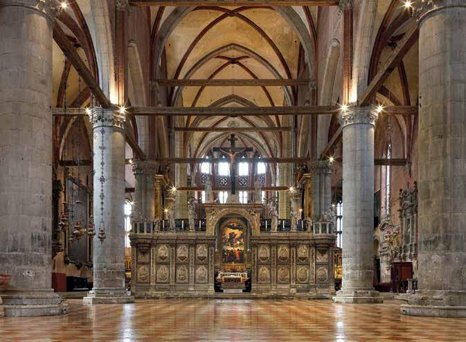 Tra i più importanti e vitali centri religiosi e monastici di Venezia, il complesso dei Frari – chiamato anche Ca’ Granda per le dimensioni della Basilica: 102 metri di lunghezza per 48 di larghezza e 28 di altezza – affonda le radici nella predicazione del messaggio di semplicità e povertà di San France sco da parte dei suoi frati Minori (dai veneziani detti “frari”), che da Assisi si erano mossi in tutta Italia e, in seguito, anche in Europa. Presenti a Venezia già attorno al 1220, potevano disporre inizialmente di un umile oratorio situato in un’area paludo sa, donata loro dalla Repubblica intorno al 1230. Ben presto però (1250 circa) fu necessario costruire una chiesa più grande, adatta ad accogliere il crescente flusso di fedeli che giungevano da ogni dove. Questa fu a sua volta sostituita da un terzo edificio, che corrisponde all’attuale Basilica; i lavori, iniziati nel 1330, durarono fino al 1440 circa. La fabbrica monumentale, in stile gotico, fu eretta grazie alla generosità di alcune facoltose famiglie veneziane e grazie alle elemosine dei molti benefattori. Consacrata cinquant’anni dopo, nel 1492, fu dedicata alla Vergine assunta in cielo: Santa Maria Gloriosa dei Frari. All’interno della Basilica, solenne e ricca di capola vori, domina incontrastata, come una gemma nella zona presbiteriale, L’Assunta di Tiziano Vecellio. La grande pala, inserita in un’imponente cornice marmorea, fa da quinta scenografica al maestoso presbiterio absidato e, oltre ad aver ispirato pagine famose della critica d’arte sulla pittura del giovane Tiziano e sulle sottili questioni teologiche e dogmatiche tra francescani e domenicani, è da più di cinquecento anni la protagonista indiscussa di tutte le celebrazioni liturgiche che si svolgono in chiesa: dai battesimi ai matrimoni, dalle comunioni alle cresime, dalle messe giornaliere e domenicali a quelle solenni, fino ai funerali.
