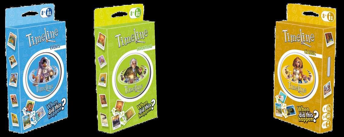 Timeline is a card game where each card depicts a historical event, invention or discovery on both sides, with the year in which that event occurred, invention or discovery was made on only one side.