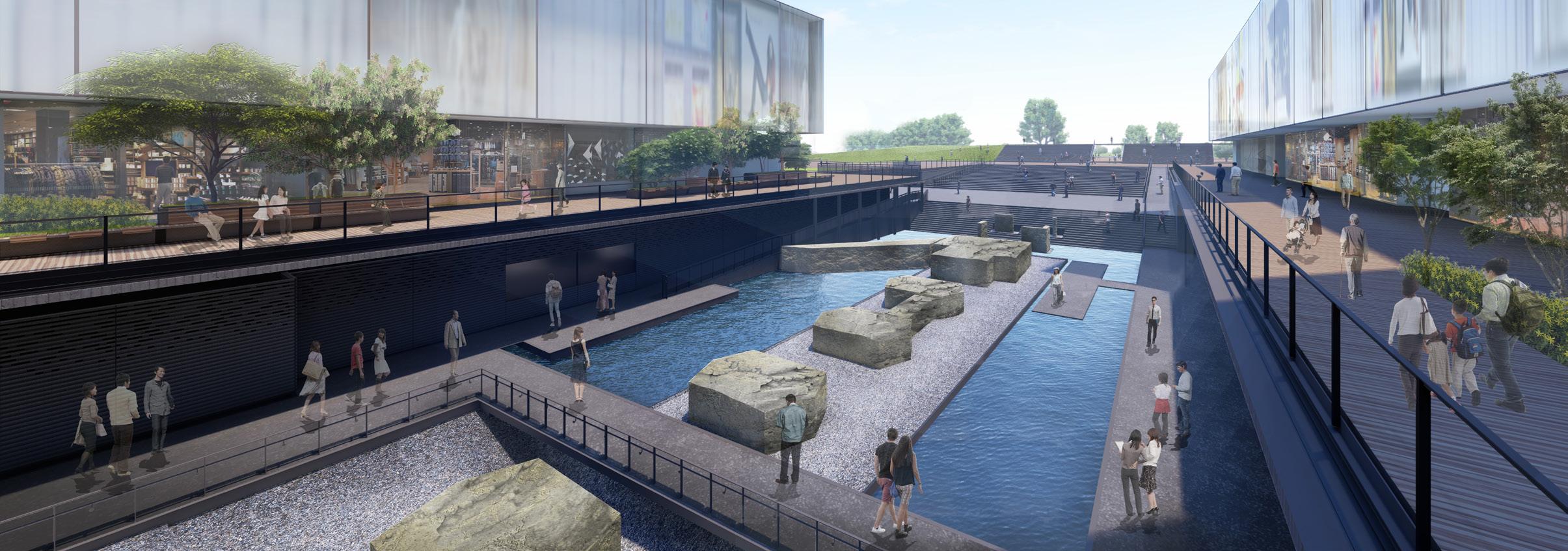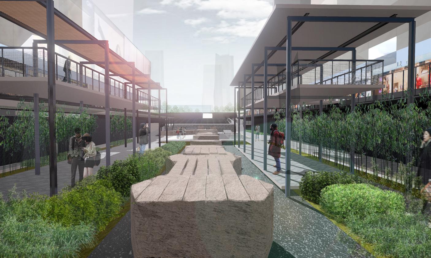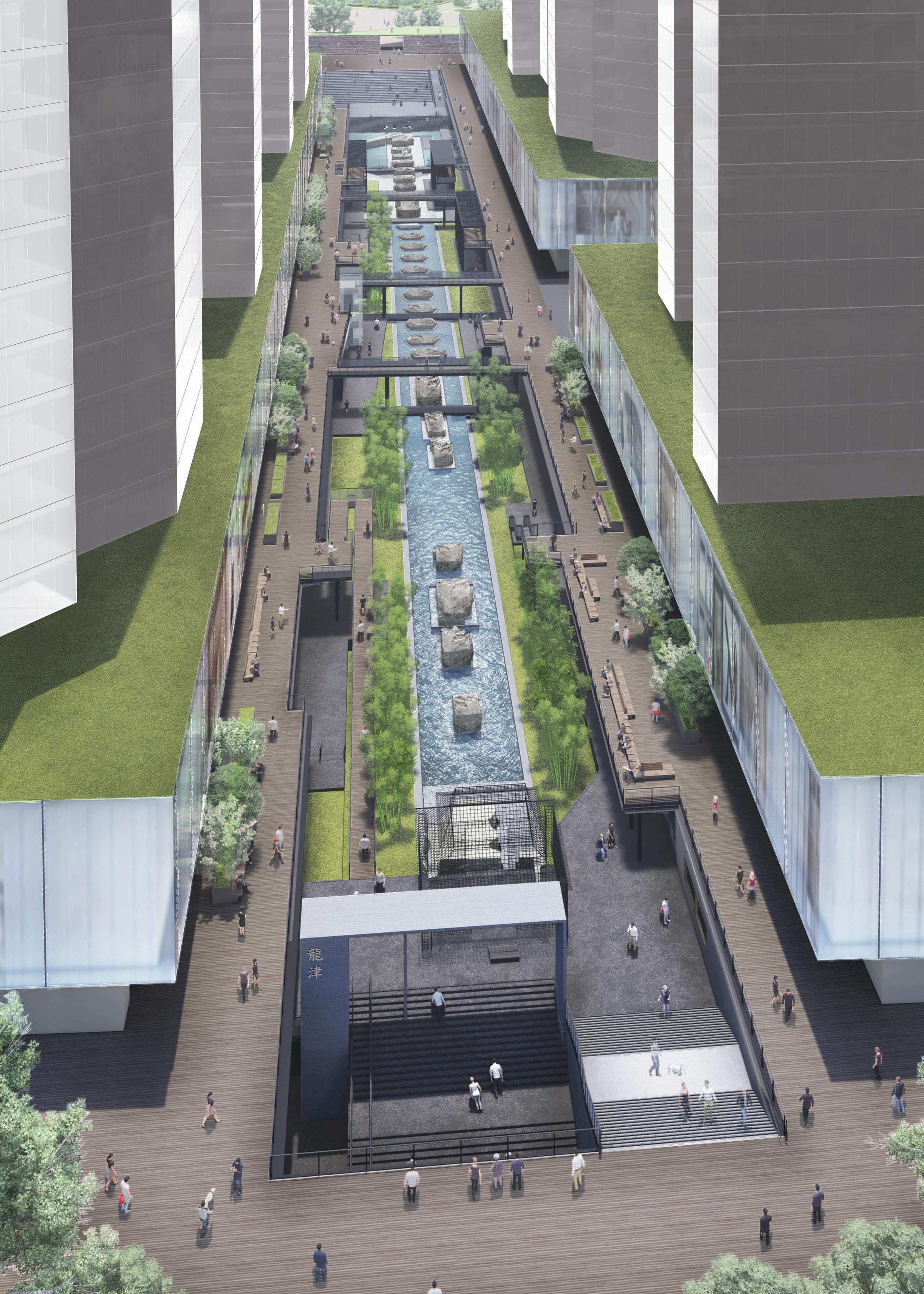 By responding to the characters of the remnants, geography and the surrounding activities, experiences are generated along the sunken Urban Valley. The entrance plaza of the urban valley is designed with a portal in fairface finish, welcoming visitors to experience the garden and archaeological exhibition. A silhouette to symbolize the Pavilion for Greeting Officials will appear together with its remnants, as a reminiscence of the Pavilion in the past history.