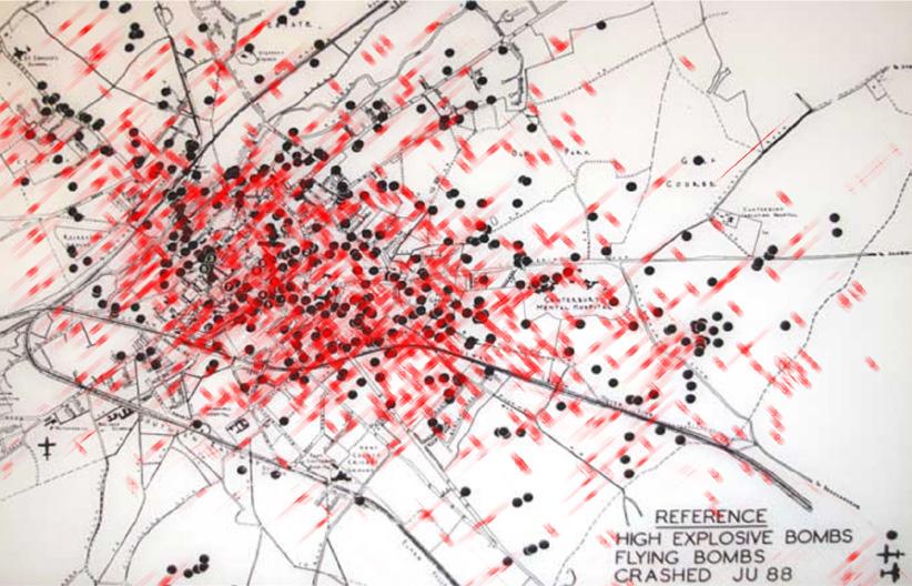 Bomb map of canterbury in second world war. The red dots represent the prediction track of the bombs from the fighter aircraft. Baedeker raids were the name given to German air attacks on the English cathedral cities of Exeter, Bath, York, Canterbury and Norwich, carried out mainly during spring and summer 1942. The main attack on Canterbury took place on 1 June 1942, shortly after the Cologne bombing