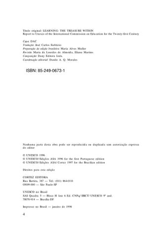 Nenhuma parte desta obra pode ser reproduzida ou duplicada sem autorização expressa do editor © UNESCO 1996 © UNESCO/Edições ASA 1996 for the first Portuguese edition © UNESCO/Edições ASA/Cortez 1997 for the Brazilian edition Direitos para esta edição CORTEZ EDITORA Rua Bartira, 387 — Tel.: (011) 864-0111 05009-000 — São Paulo-SP UNESCO no Brasil SAS Quadra 5 — Bloco H lote 6 Ed. CNPq/IBICT/UNESCO 9º and. 70070-914 — Brasília-DF Impresso no Brasil — janeiro de 1998