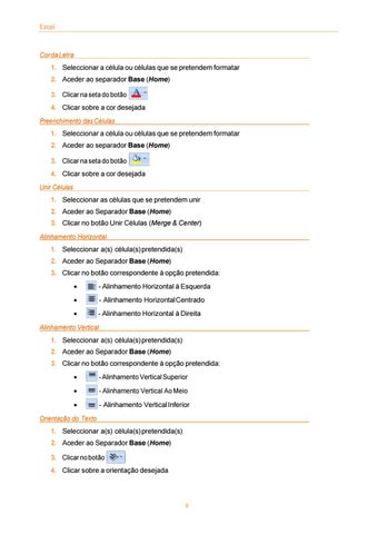 Cor da Letra 1. Seleccionar a célula ou células que se pretendem formatar 2. Aceder ao separador Base (Home) 3. Clicar na seta do botão 4. Clicar sobre a cor desejada Preenchimento das Células 1. Seleccionar a célula ou células que se pretendem formatar 2. Aceder ao separador Base (Home) 3. Clicar na seta do botão 4. Clicar sobre a cor desejada Unir Células 1. Seleccionar as células que se pretendem unir 2. Aceder ao Separador Base (Home) 3. Clicar no botão Unir Células (Merge & Center) Alinhamento Horizontal 1. Seleccionar a(s) célula(s) pretendida(s) 2. Aceder ao Separador Base (Home) 3. Clicar no botão correspondente à opção pretendida: •