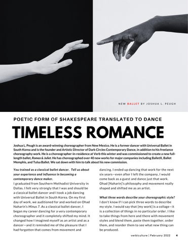 TIMELESS ROMANCE Joshua L. Peugh is an award-winning choreographer from New Mexico. He is a former dancer with Universal Ballet in South Korea and is the founder and Artistic Director of Dark Circles Contemporary Dance, in addition to his freelance choreography work. He is a choreographer-in-residence at Verb this winter and was commissioned to create a new fulllength ballet, Romeo & Juliet. He has choreographed over 40 new works for major companies including BalletX, Ballet Memphis, and Tulsa Ballet. We sat down with him to talk about his new commission. You trained as a classical ballet dancer. Tell us about