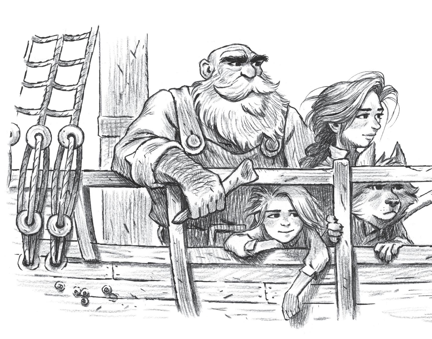 A bilo je tu i kucajuće srce broda: Podo Helmer. Jannerov djed s drvenom nogom marširao je od boka do boka, od krme do pramca, a ravnomjerno tap-klank, tap-klank njegovih koraka odzvanjalo je duboko u noć, održavajući brod živim, zajedno sa svim putnicima na njemu. Starčev je glas odzvanjao i grmio, toliko neprestano nazočan da je Janner, ako bi se zapitao gdje mu se djed nalazi, trebao samo na trenutak osluhnuti, i već bi začuo glasno izrečenu zapovijed, grlen smijeh ili lupkanje drvene noge po palubi.