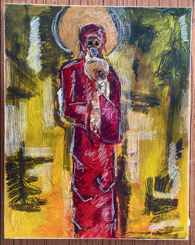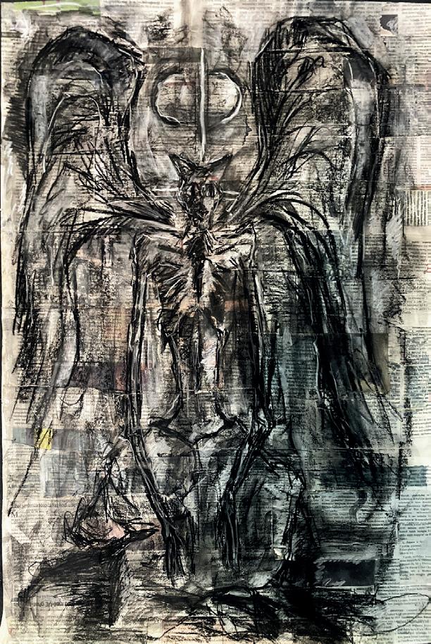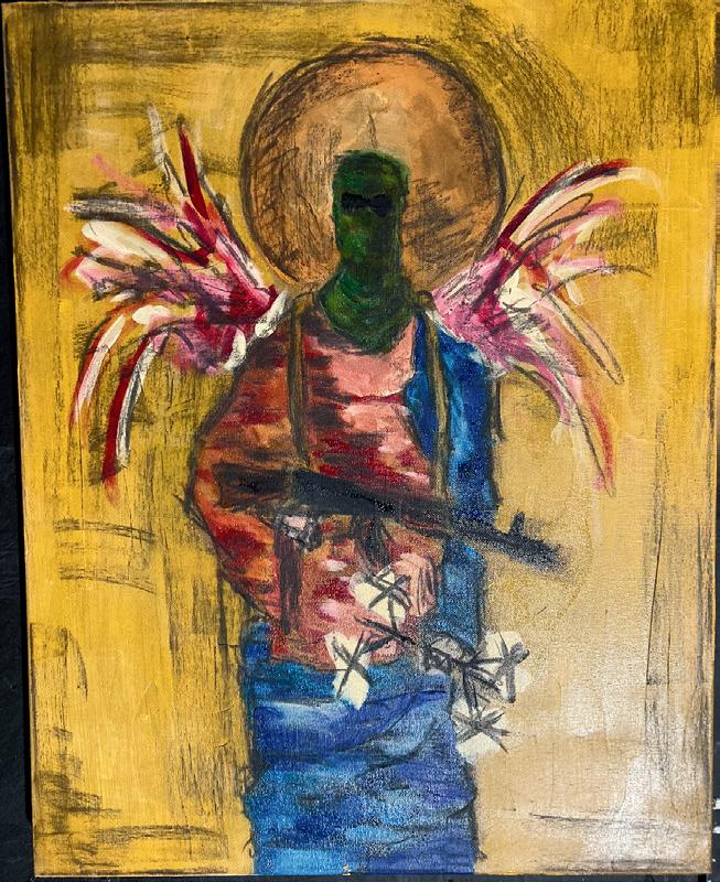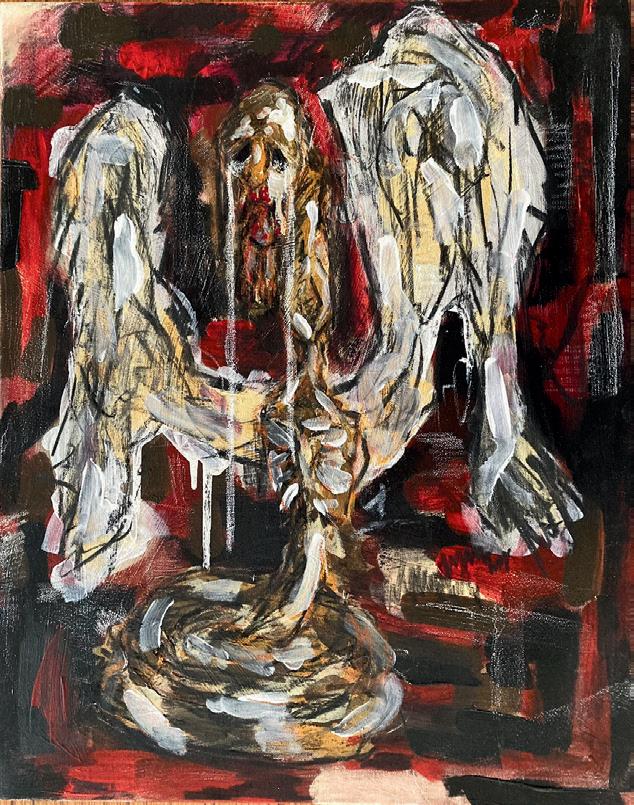 This is the main focus of the exhibition. Falling. Angels and man. With my works, I sought to critique, not theology, but the actions of the church I belong to. The Eastern Orthodox Church. Its history with war and violence is long and complex. Though it claims to be the “Church of Peace”, the actions of some (some, but not all) patriarchates within the church actively support war against other Orthodoxies. Meanwhile sin runs wild through the world. People forgetting mercy, shame, humbleness. Meanwhile people are starving and drowning.